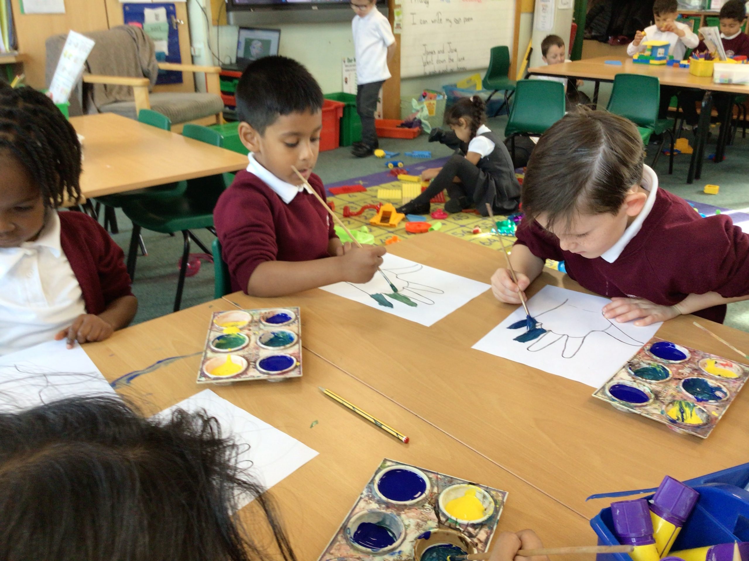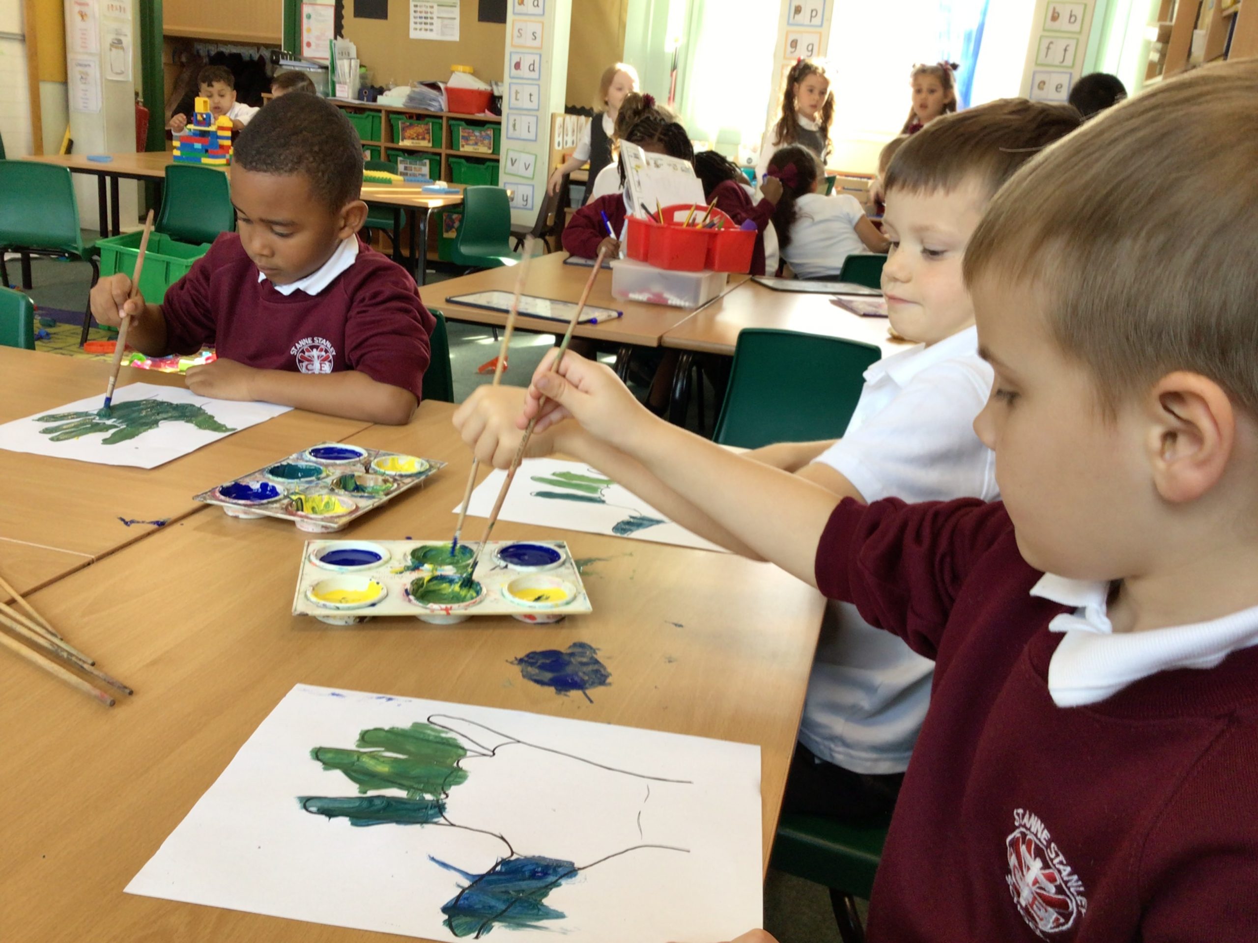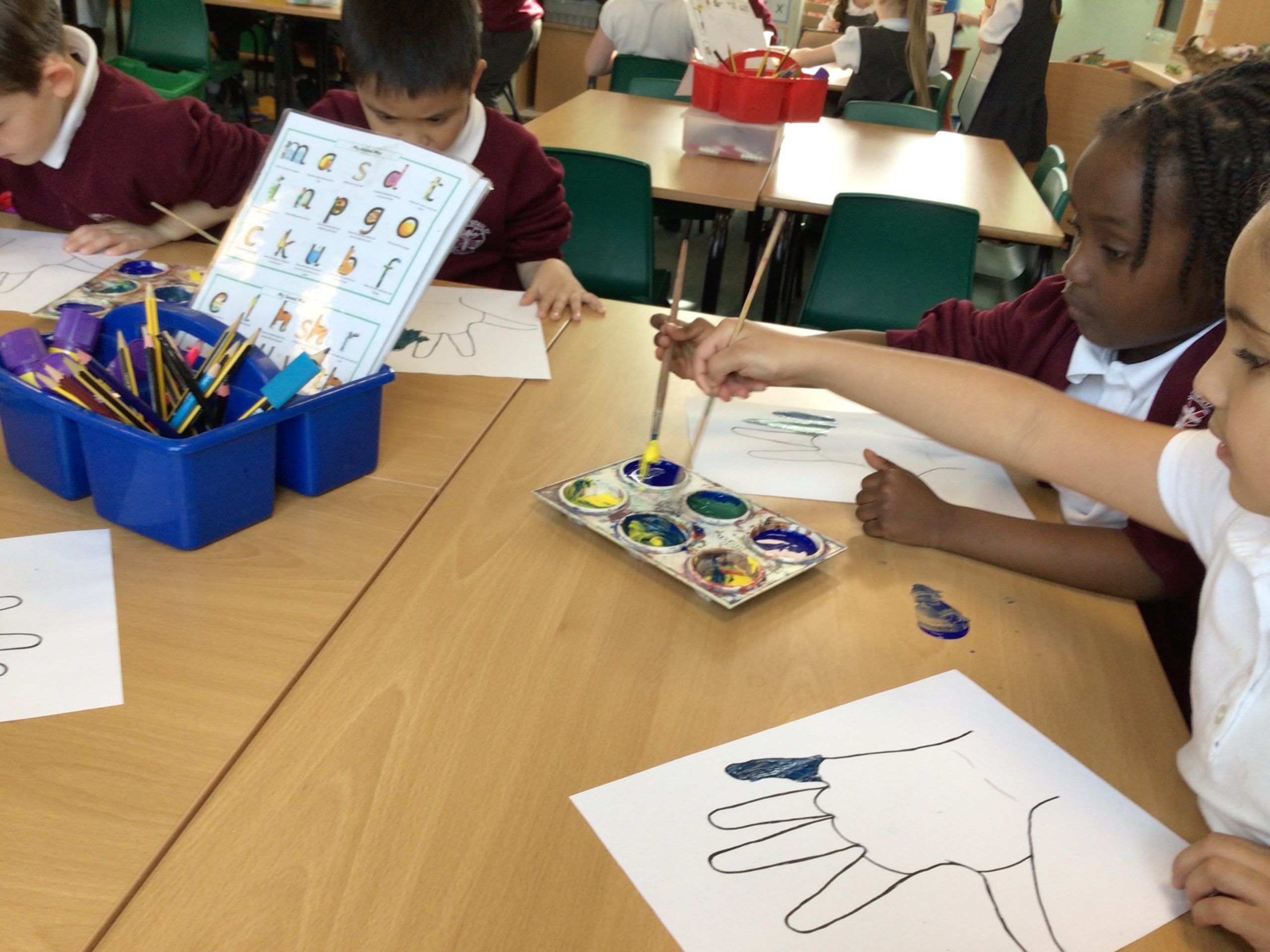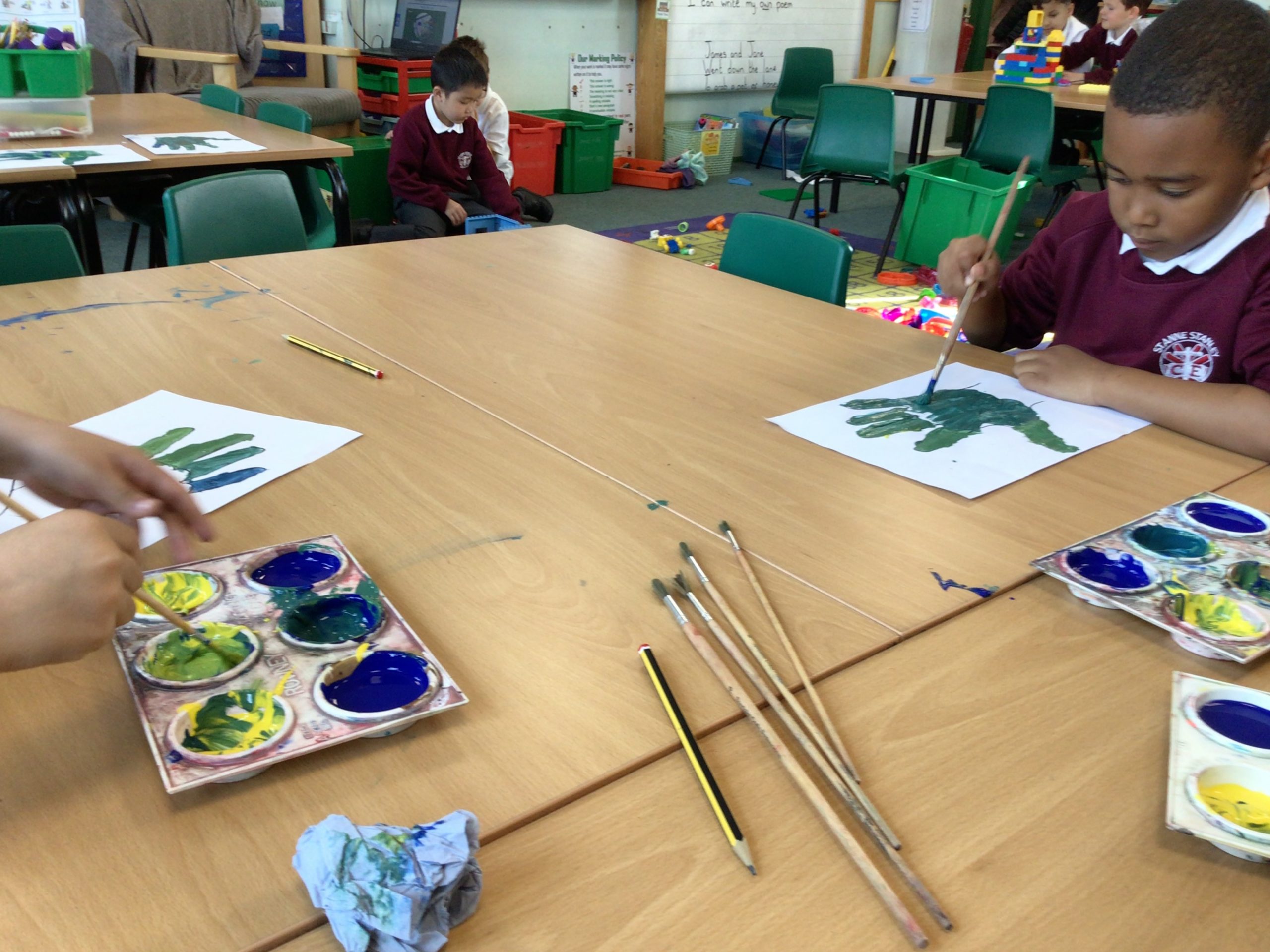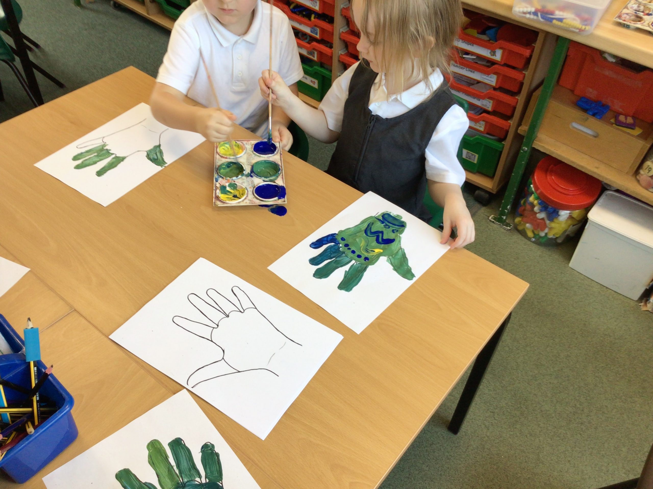We have been looking at primary and secondary colours in our Art lessons and worked out how to create different shades of green to decorate a handprint.