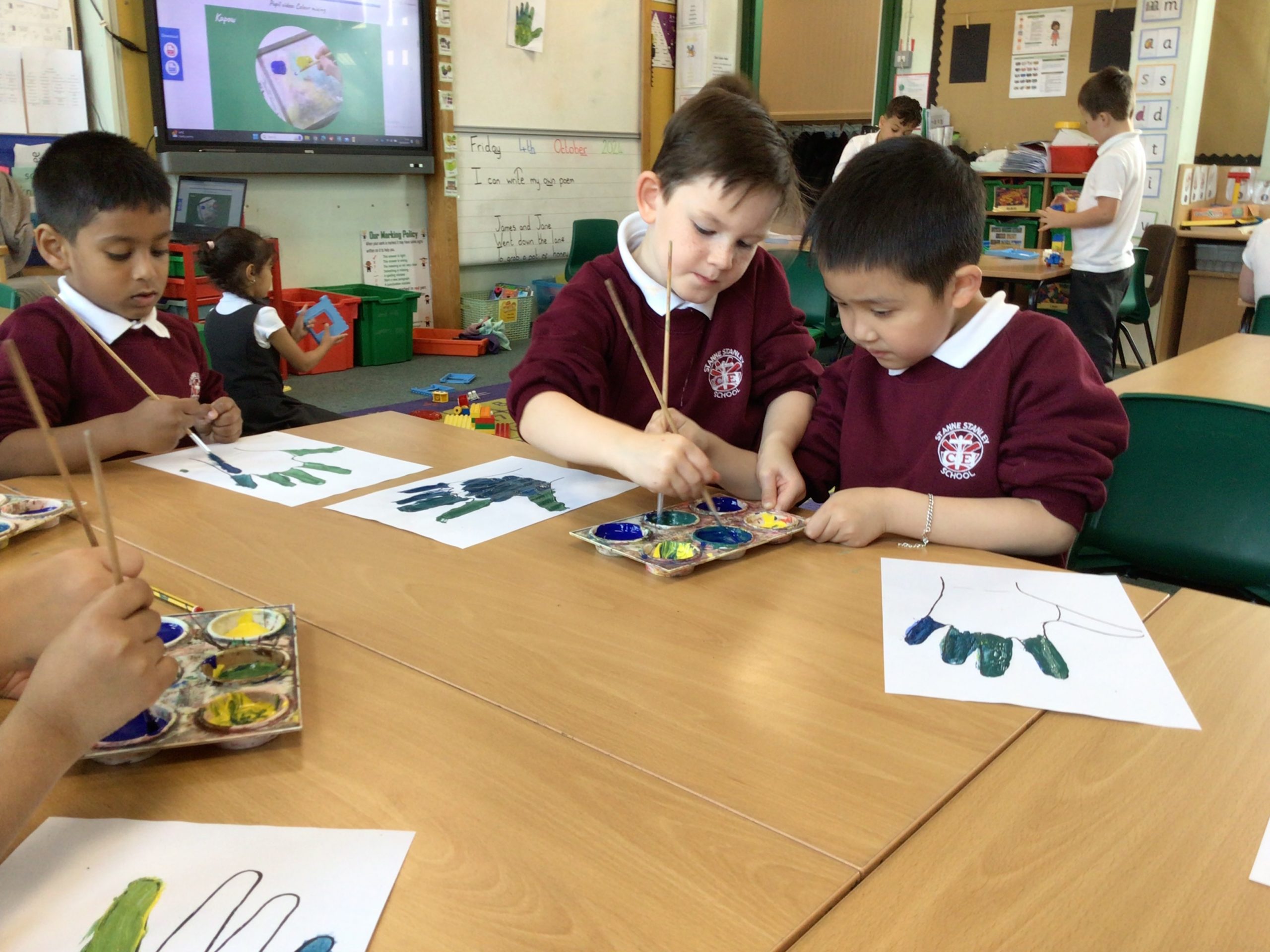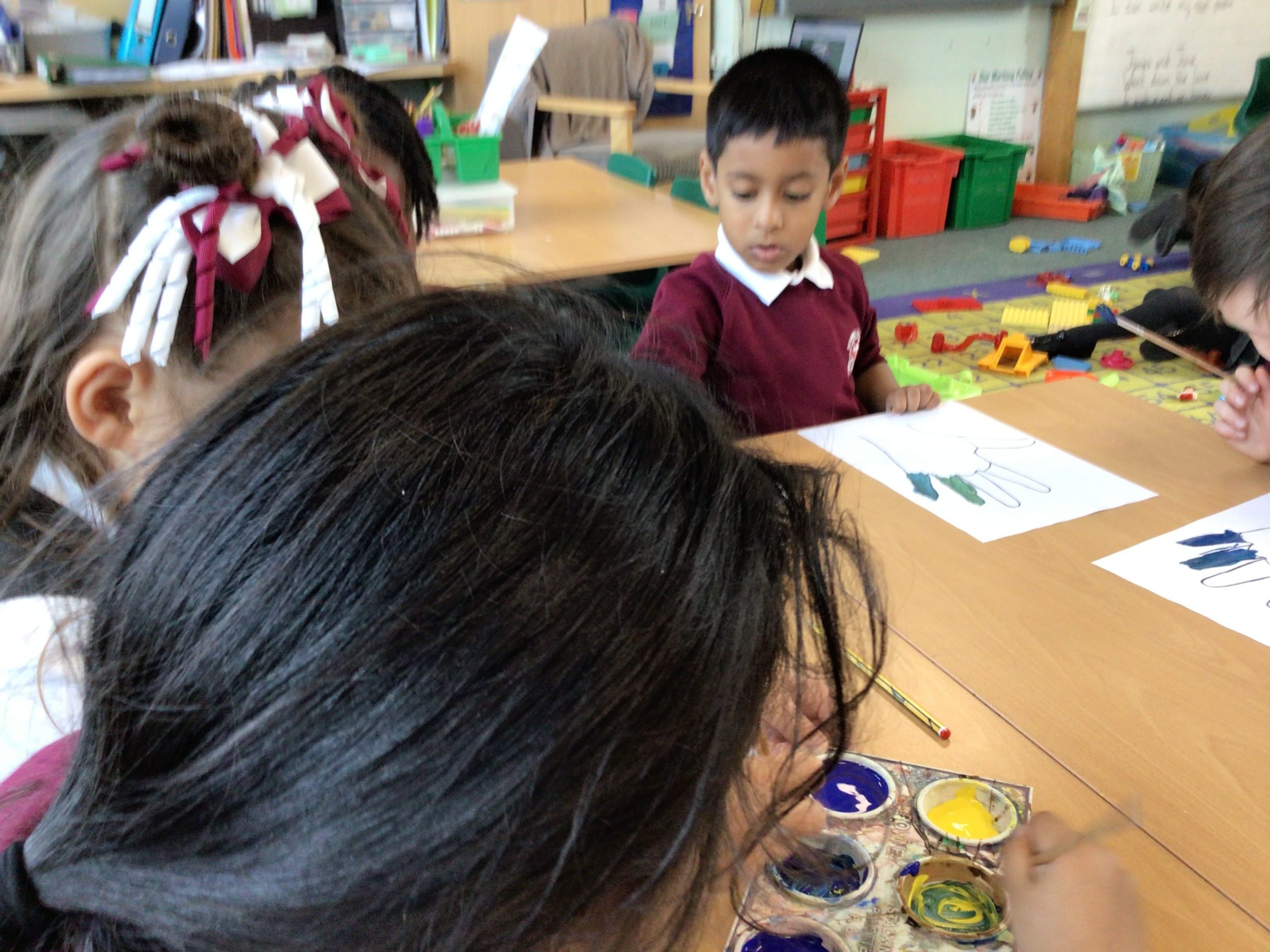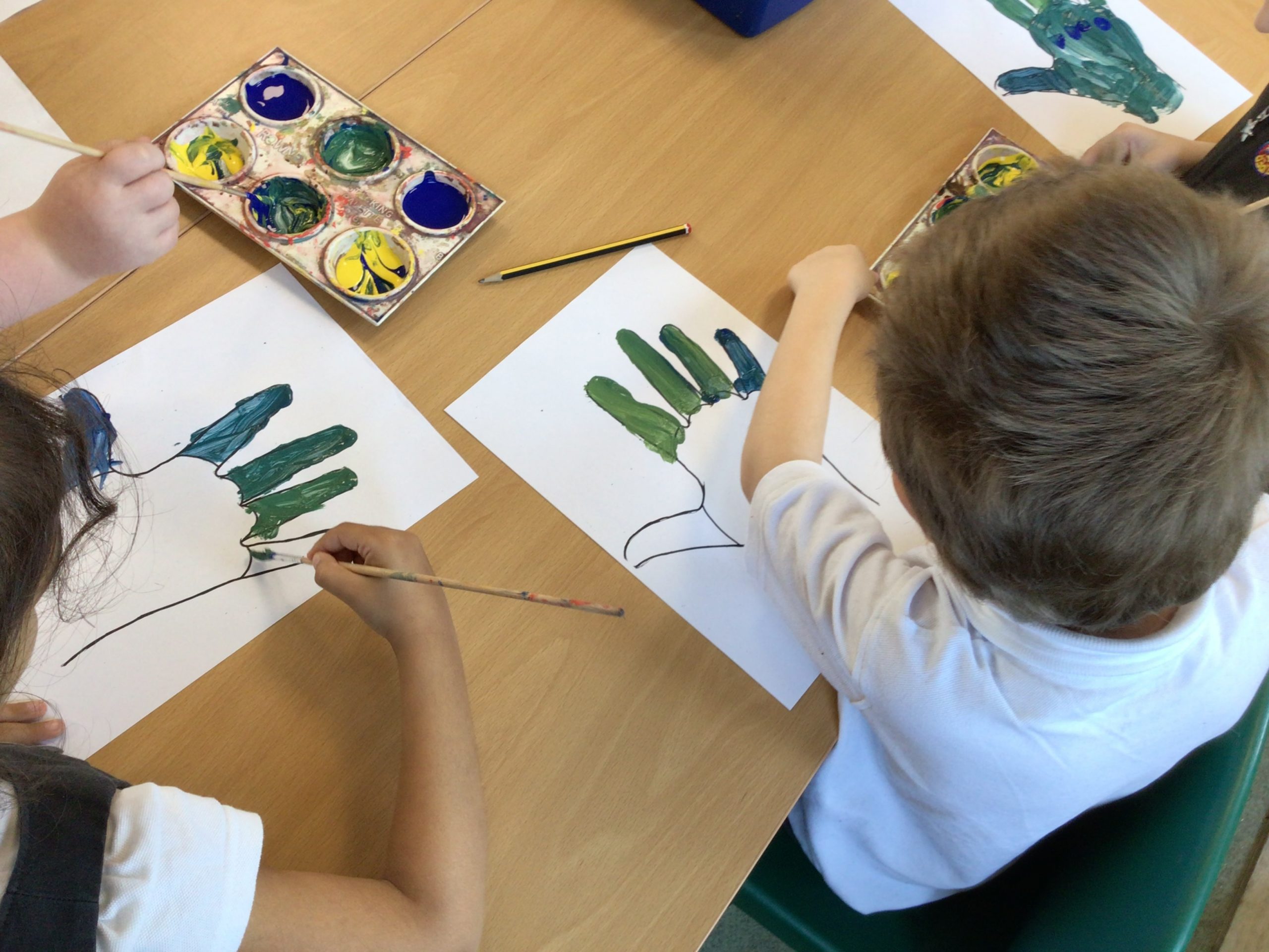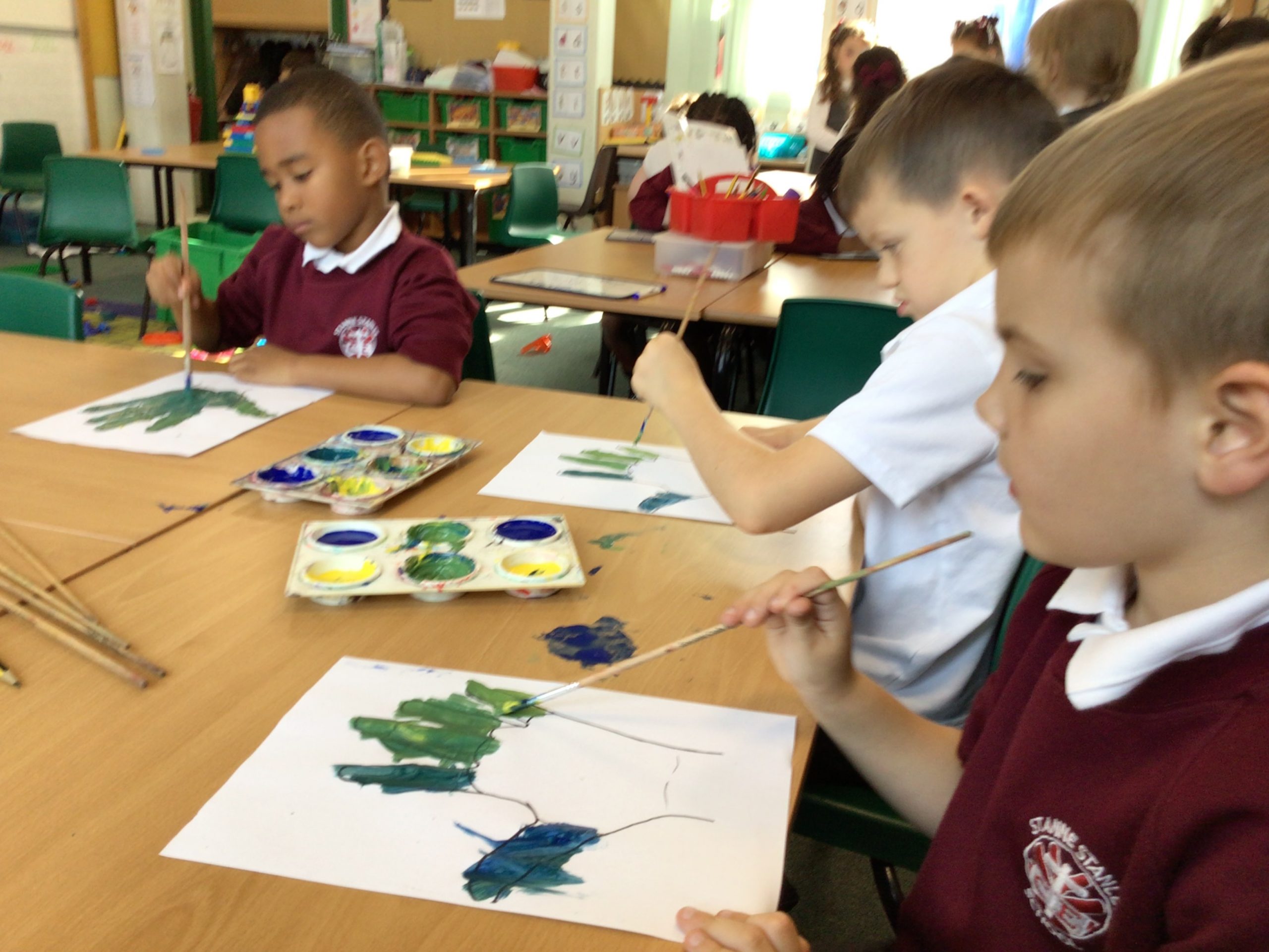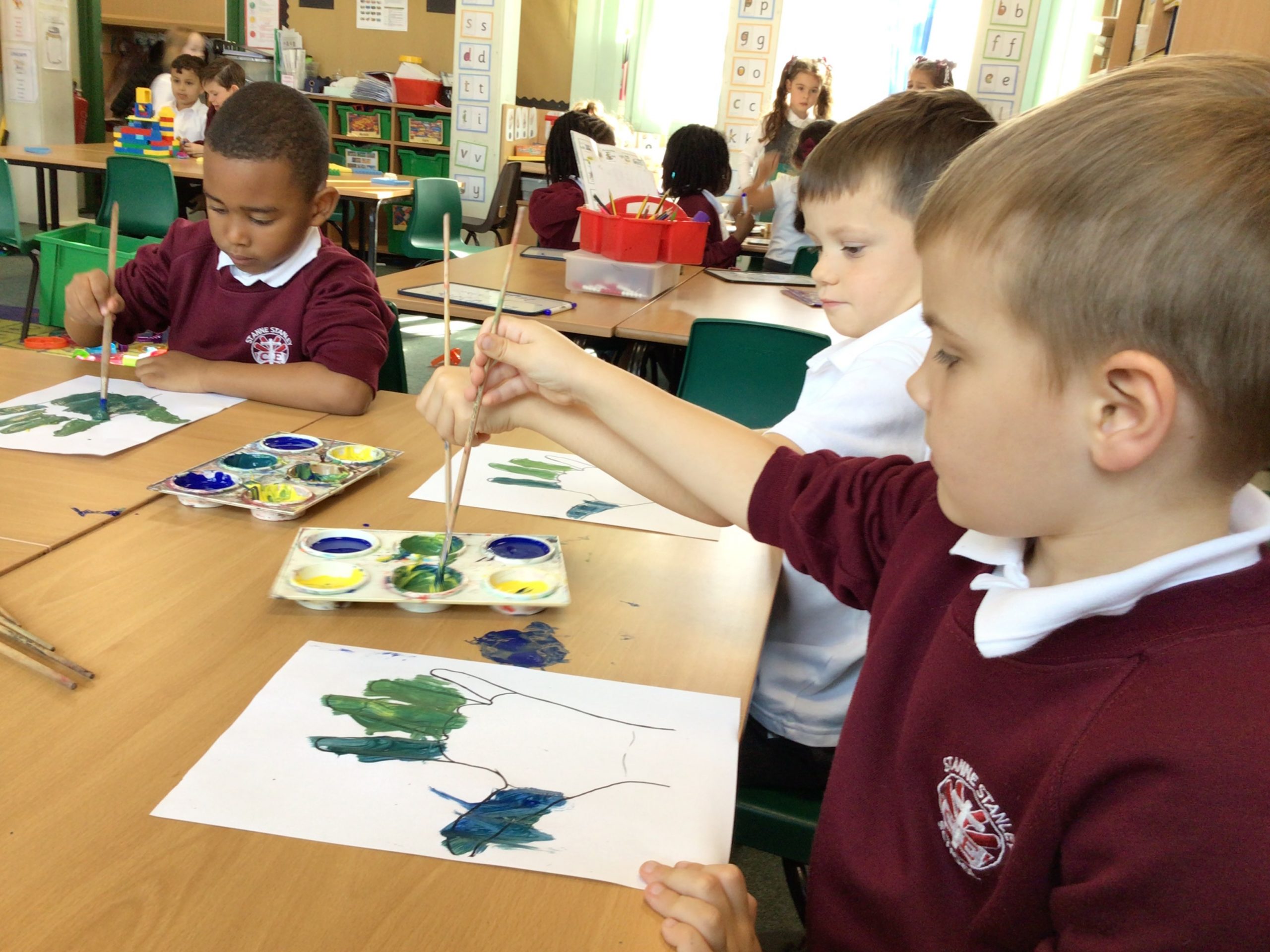 We have been looking at primary and secondary colours in our Art lessons and worked out how to create different shades of green to decorate a handprint.
