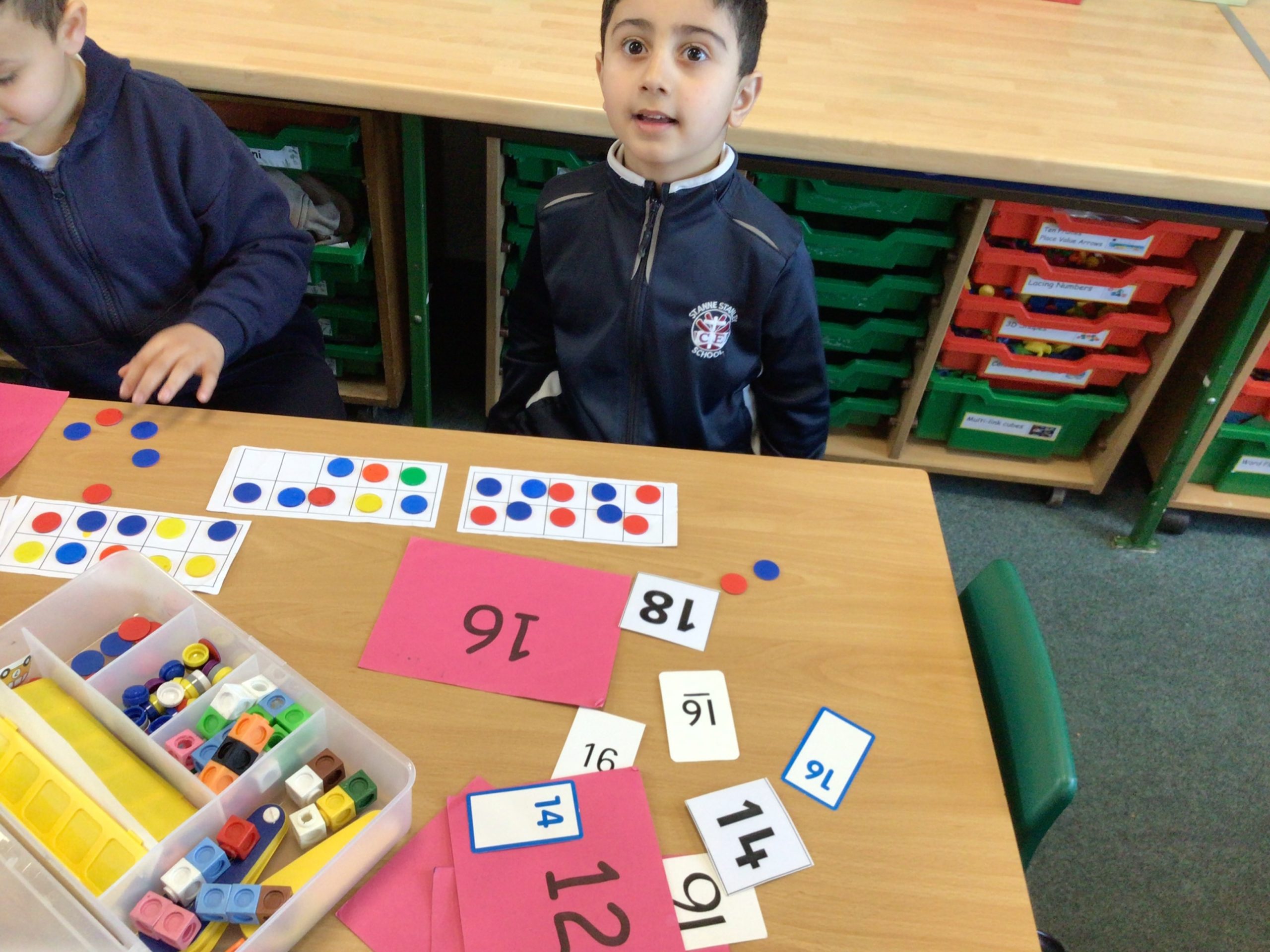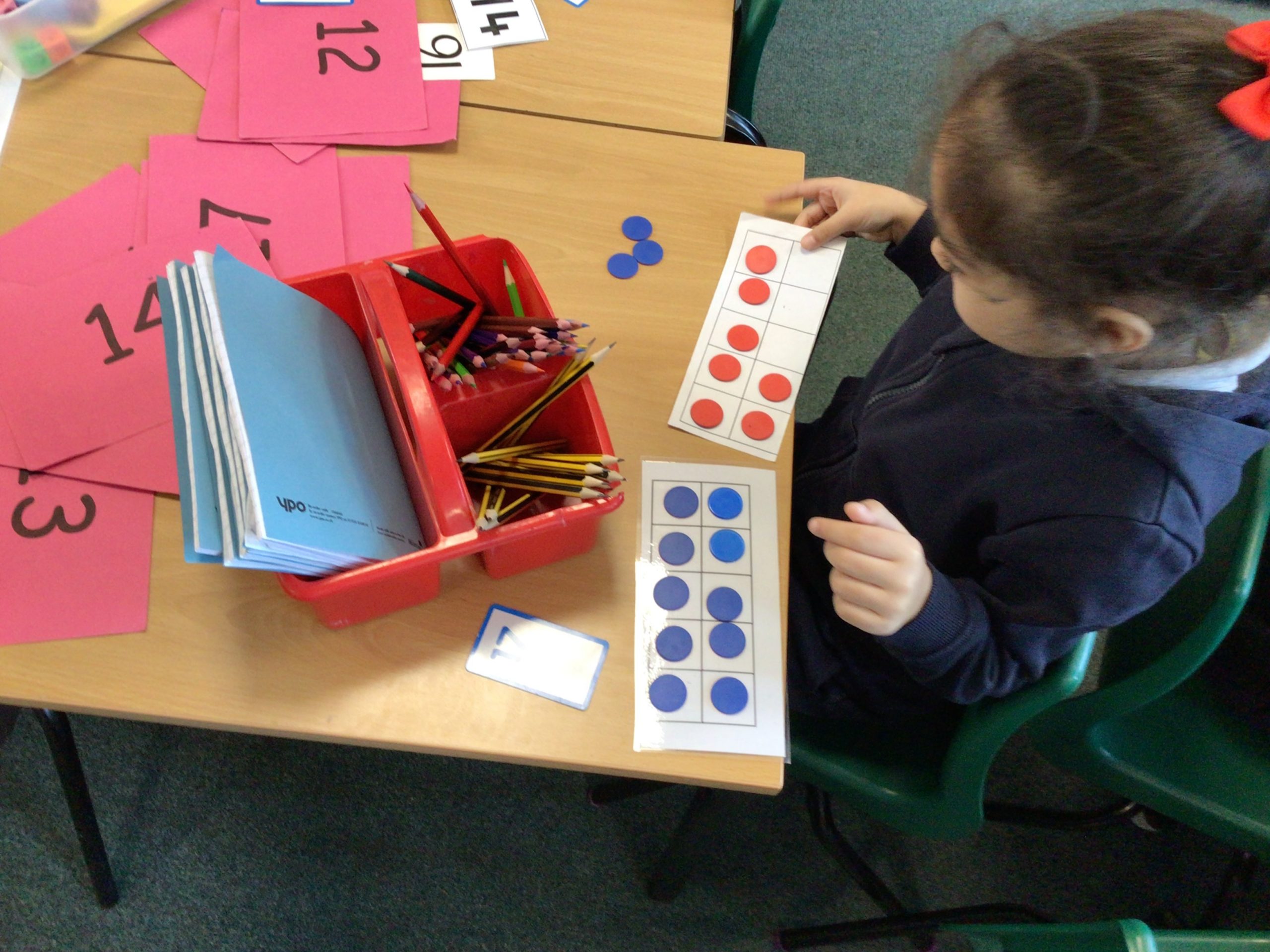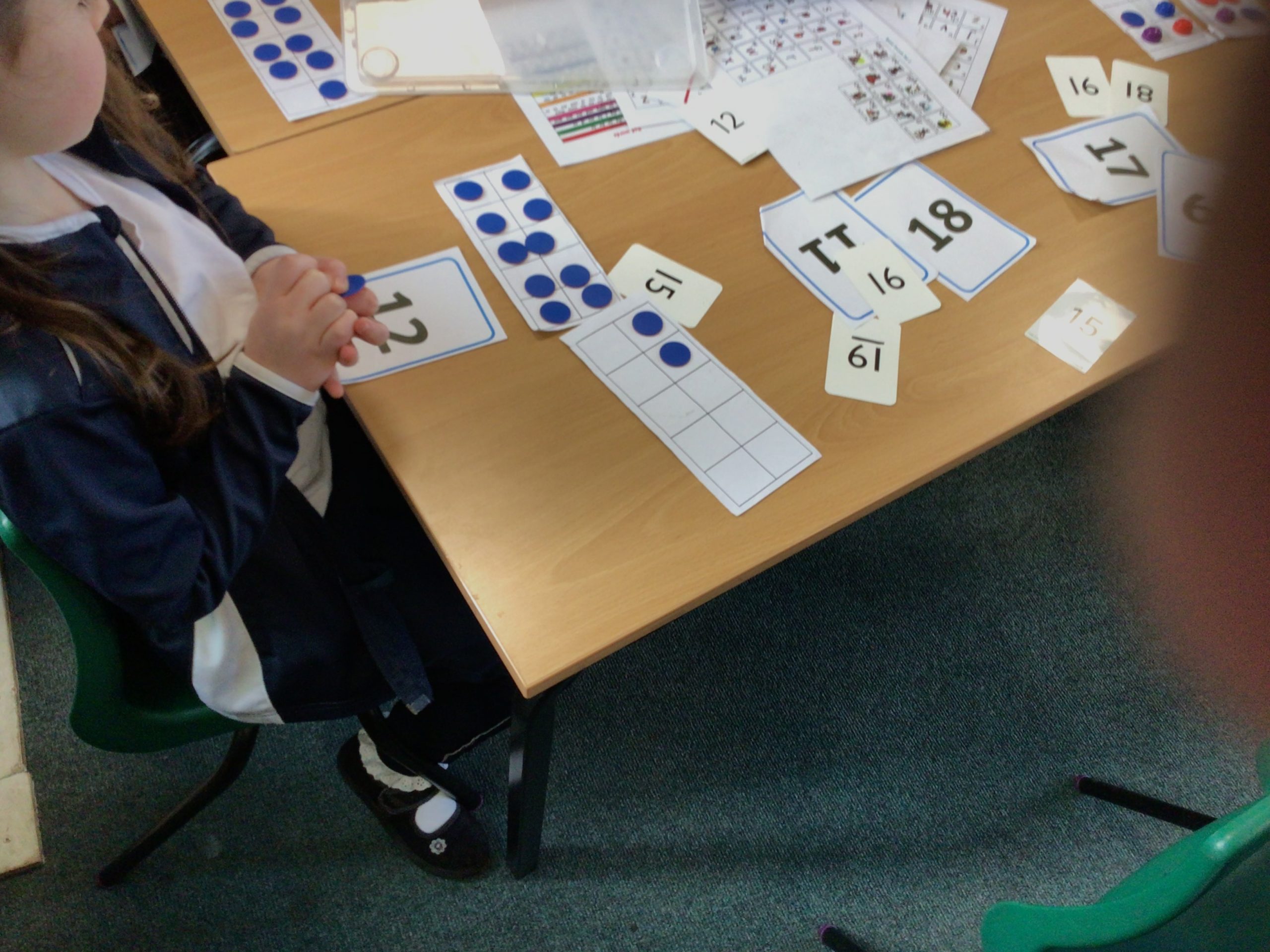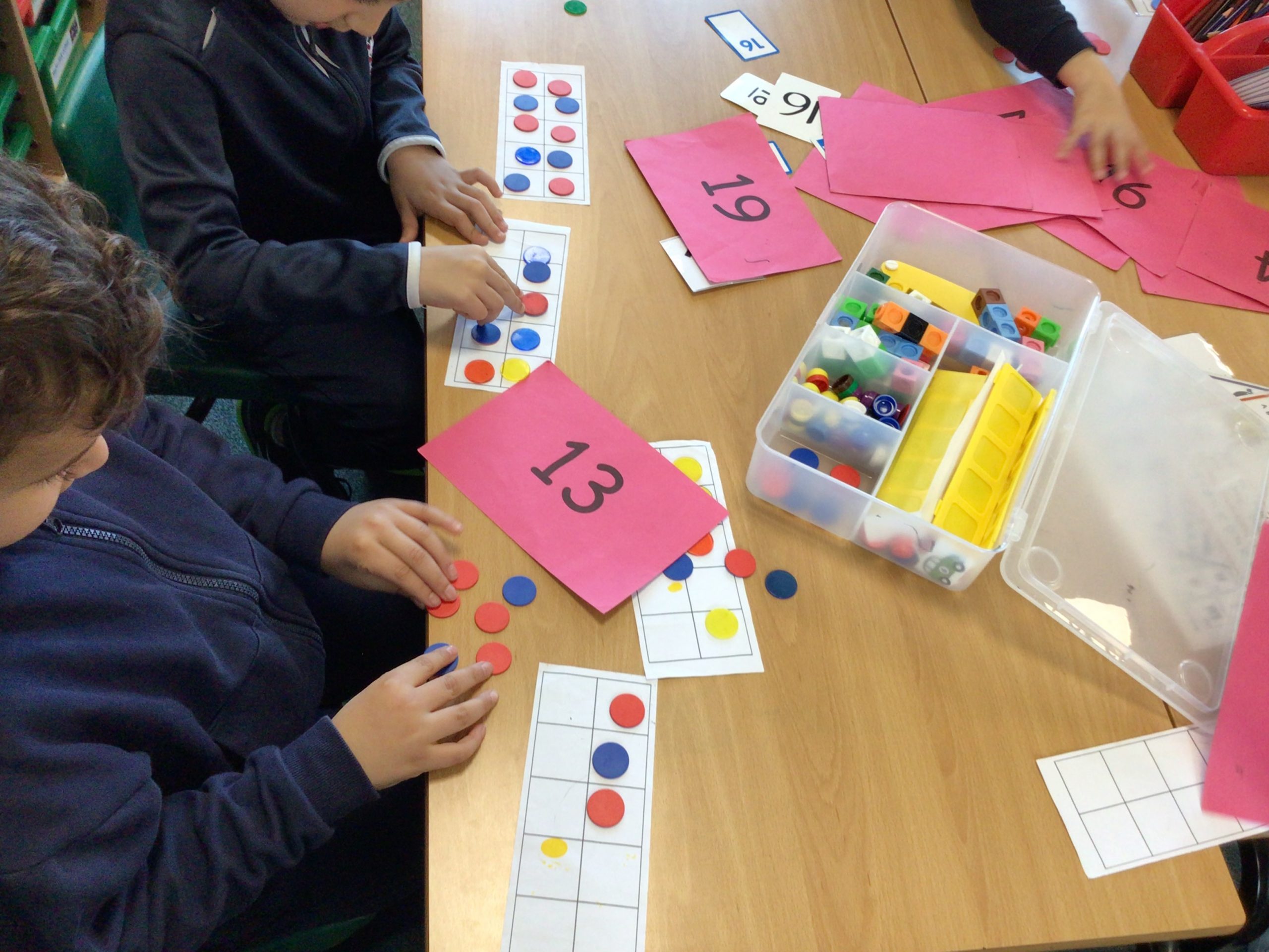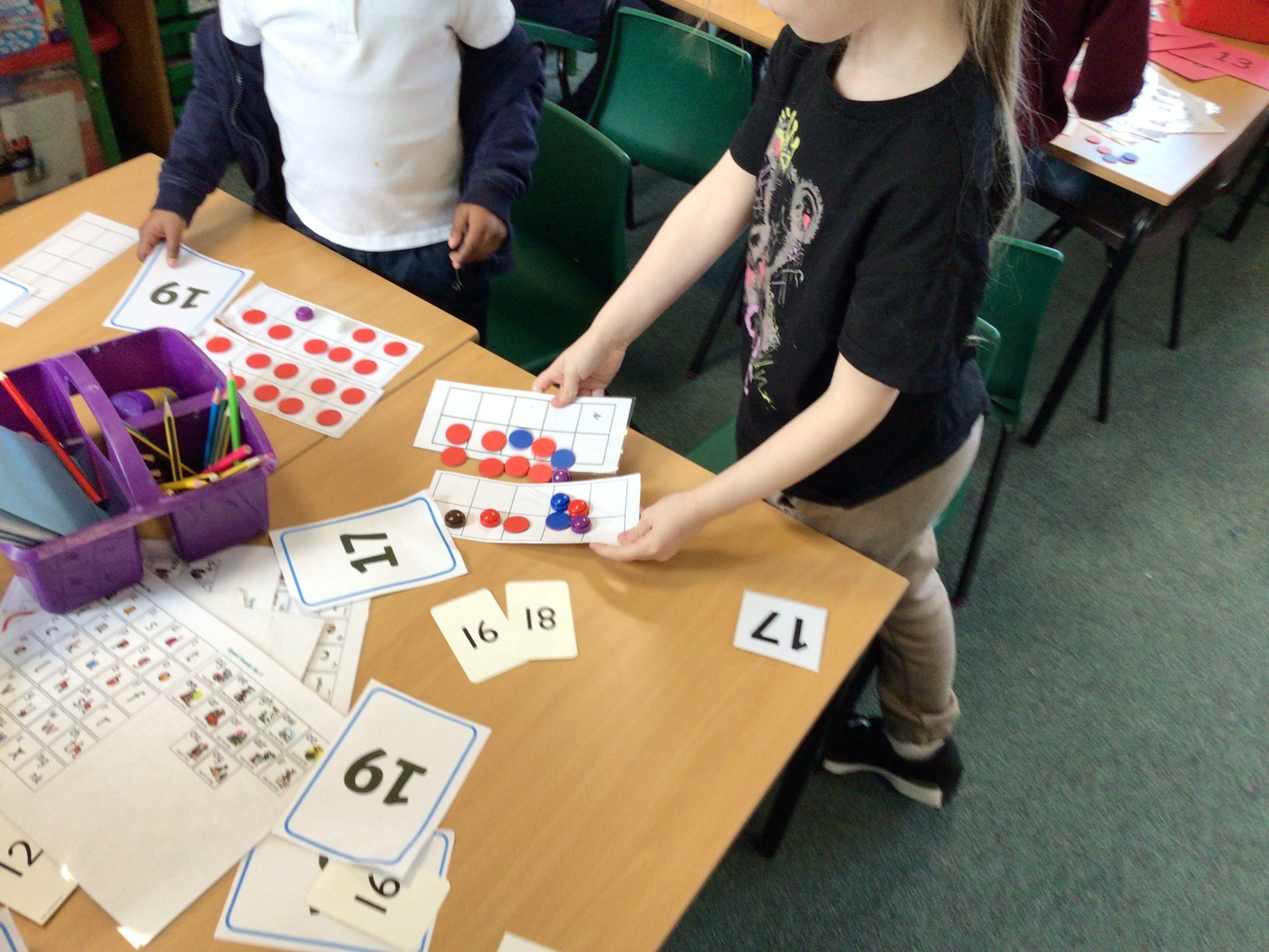 We are learning about Place Value within 20. We have been finding out about teen numbers and have used ten frames to show that one full ten plus some of another ten shows us teen numbers.