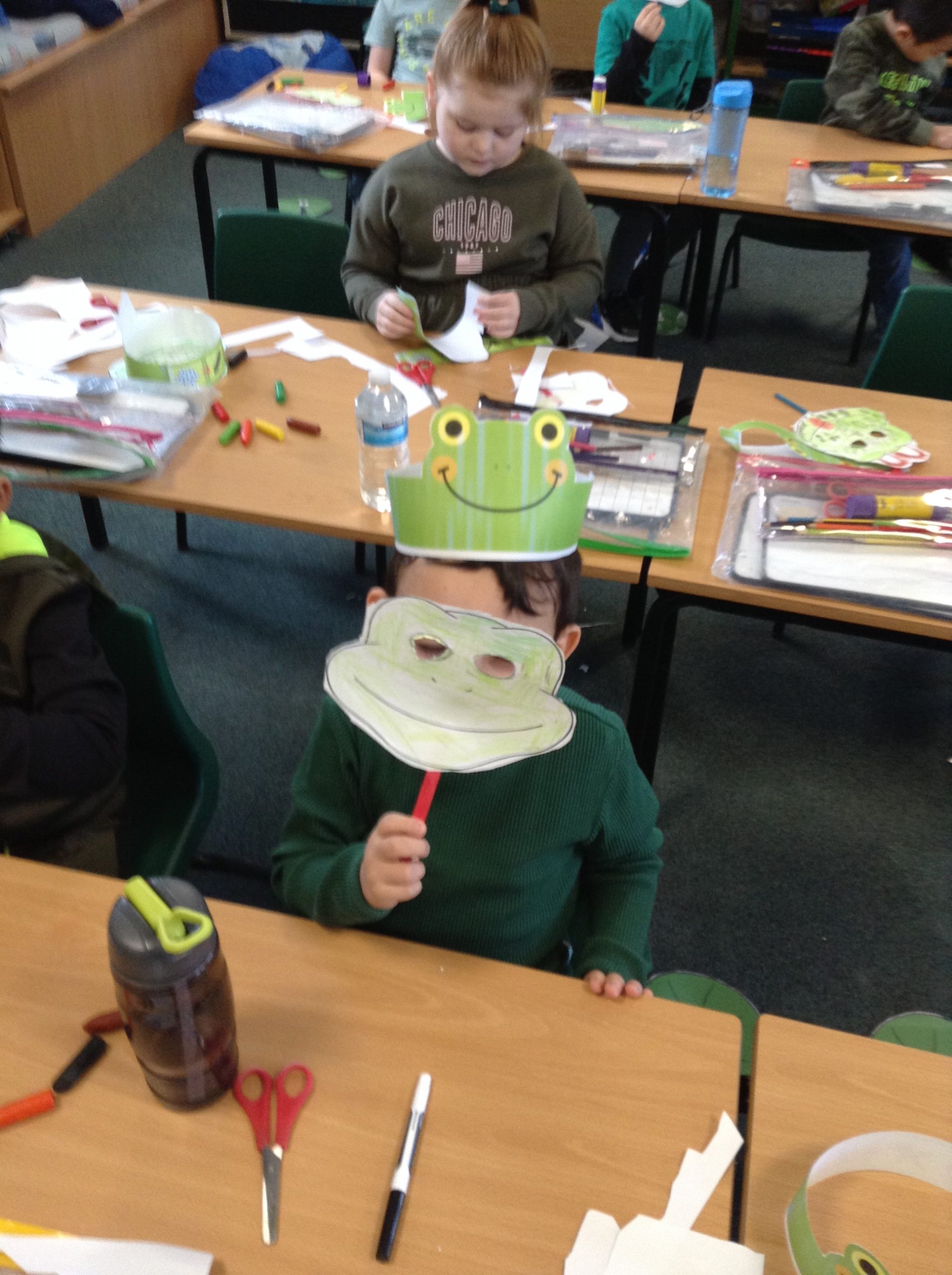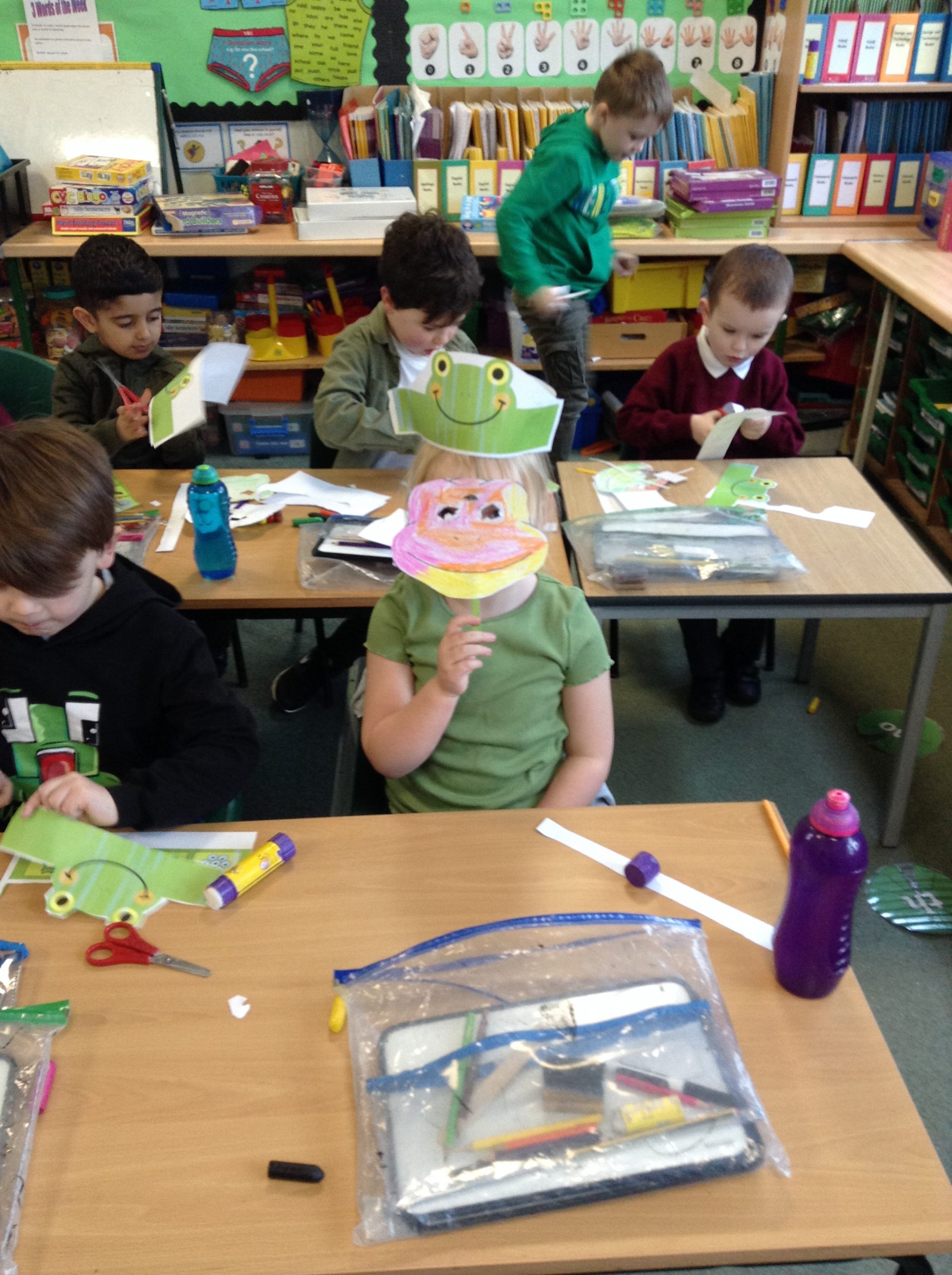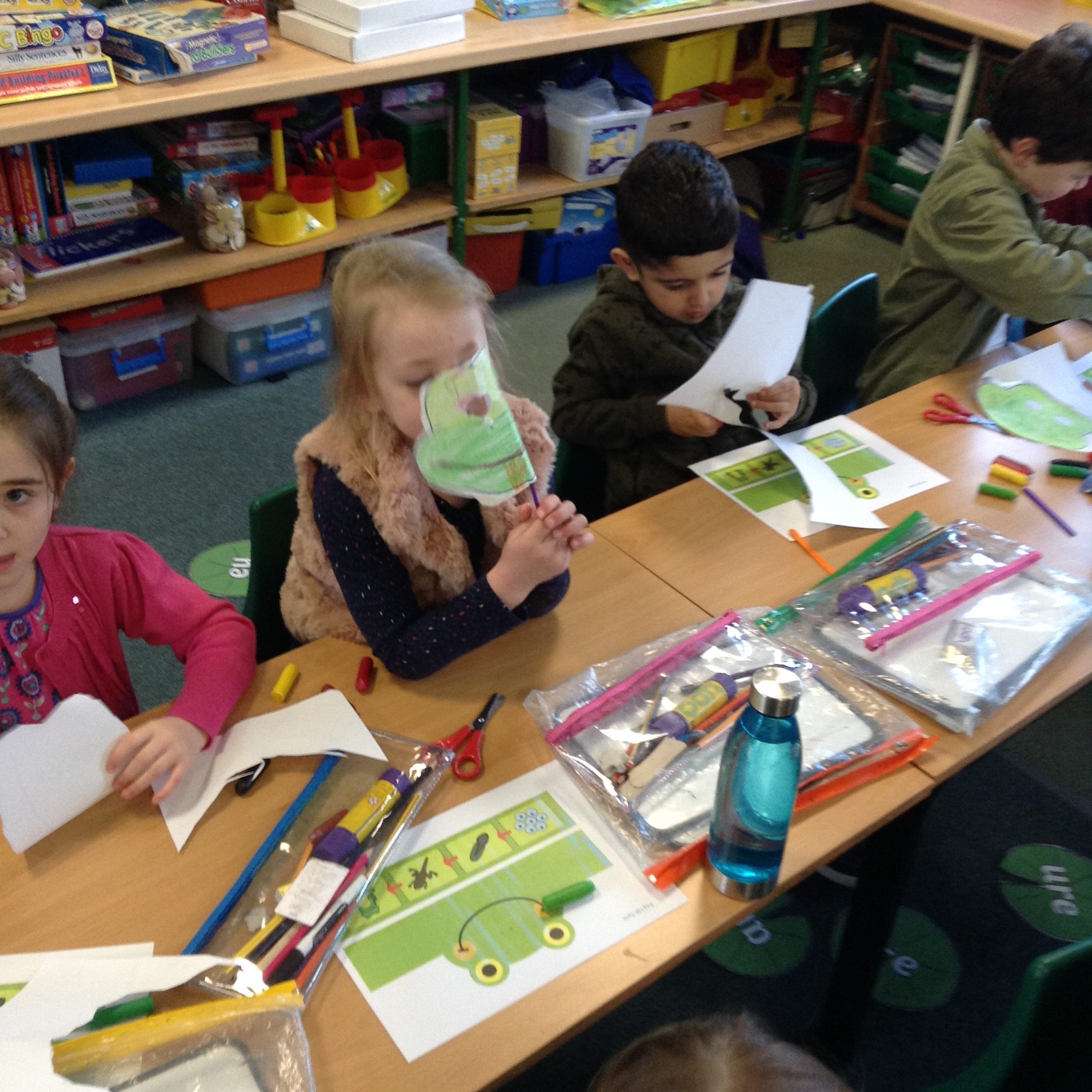 We decided to celebrate our achievements of Phonics that we had been doing at home and in school. We held a Fred Phonics Day and everyone dressed in green to be just like Fred Frog. We played lots of Phonics games, did Phonics activities and Cheryl our cook even made us some green crispy cakes for our snack. We had a great day