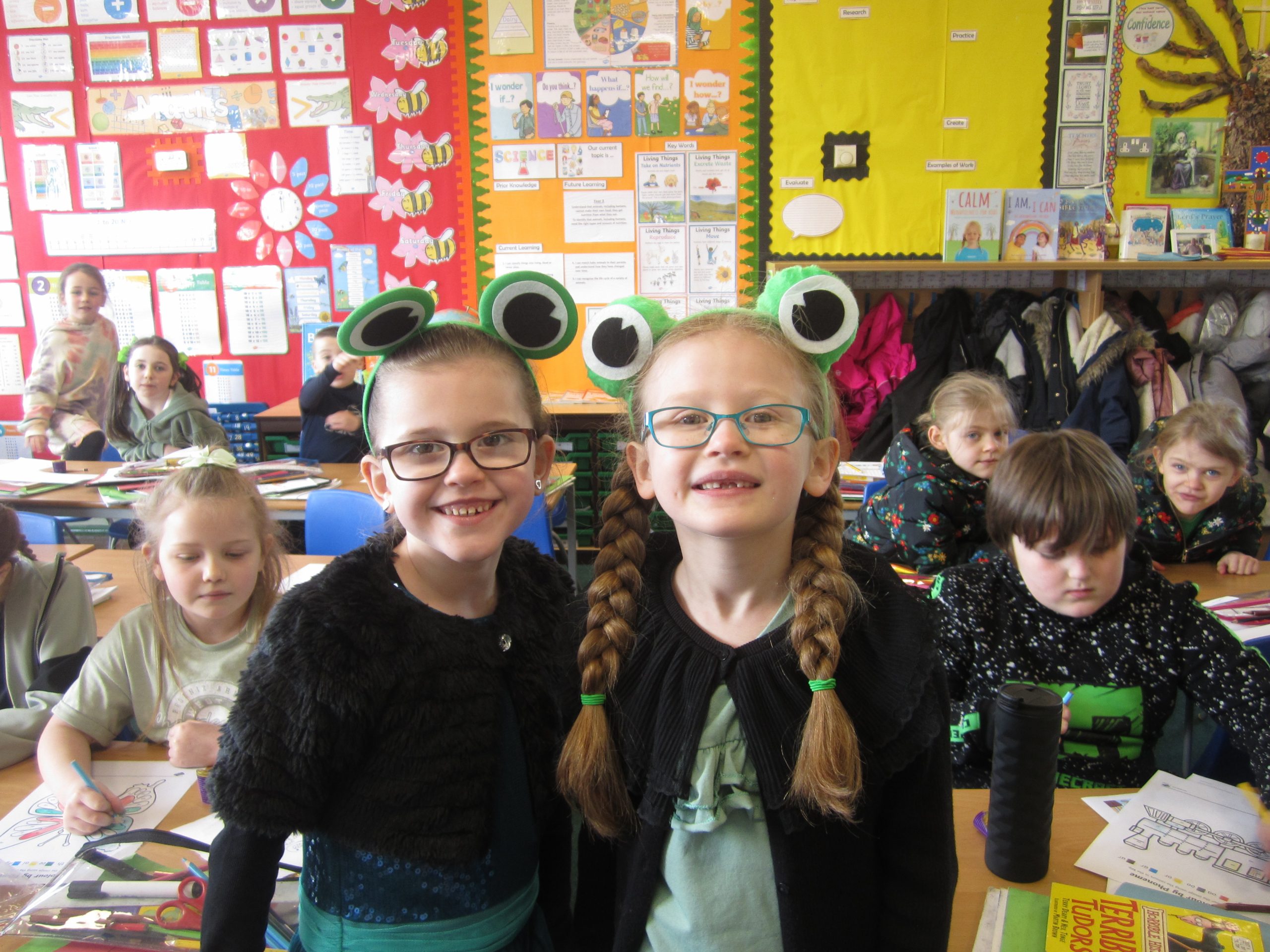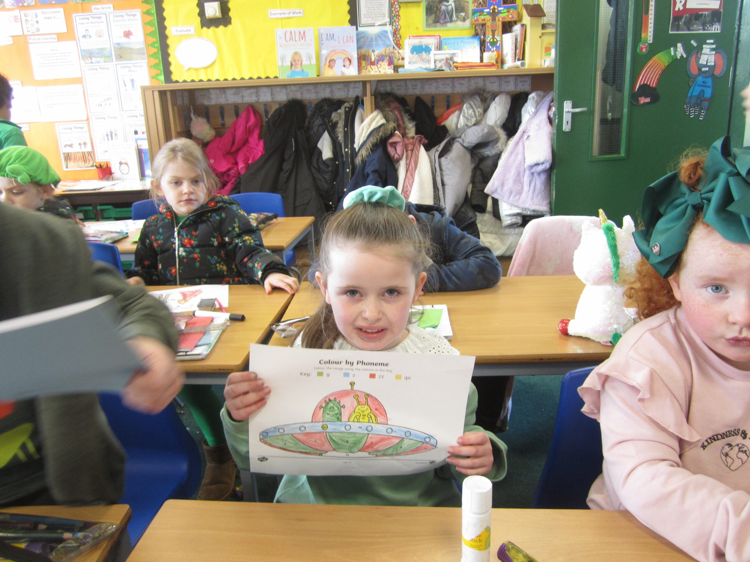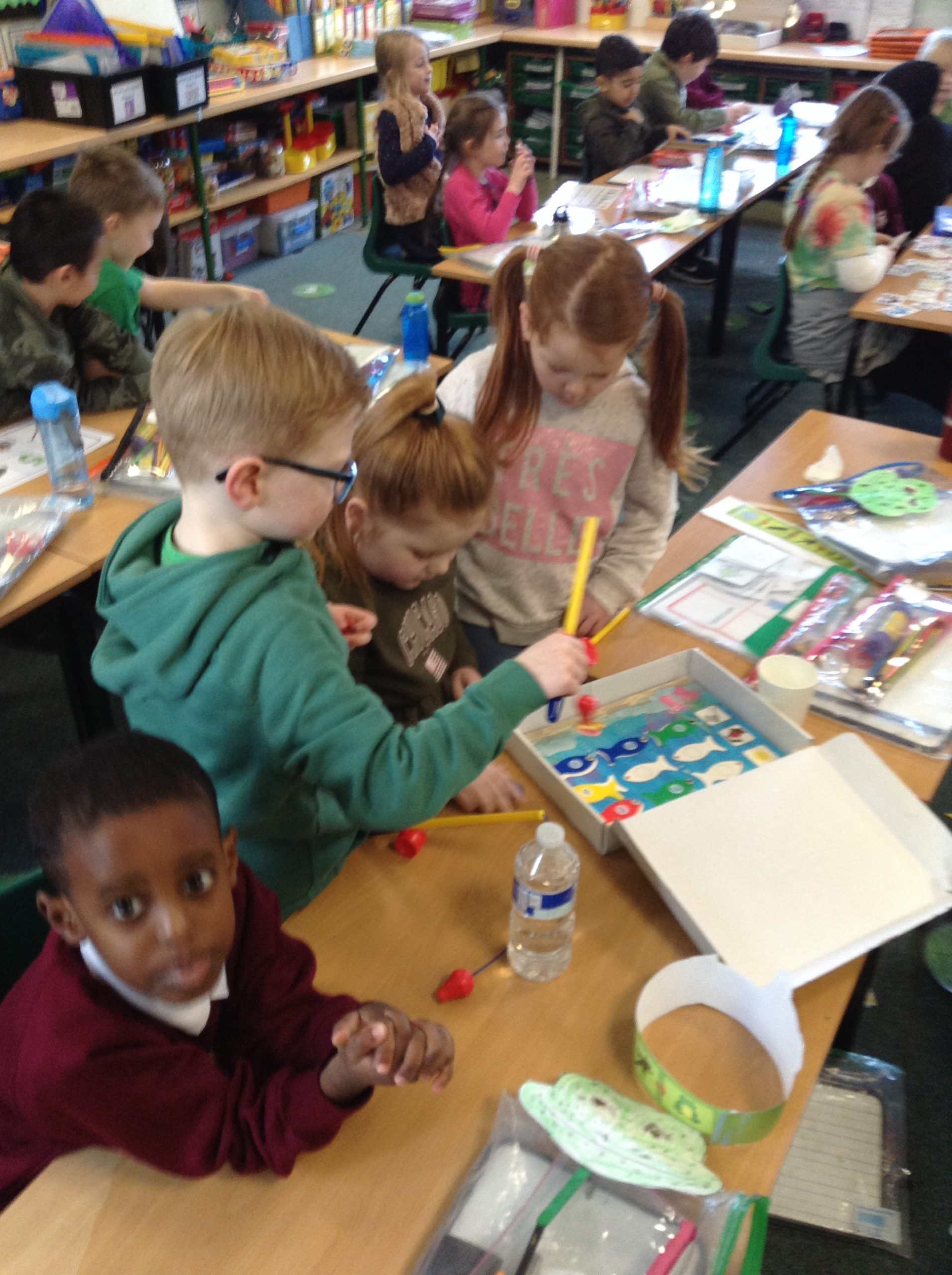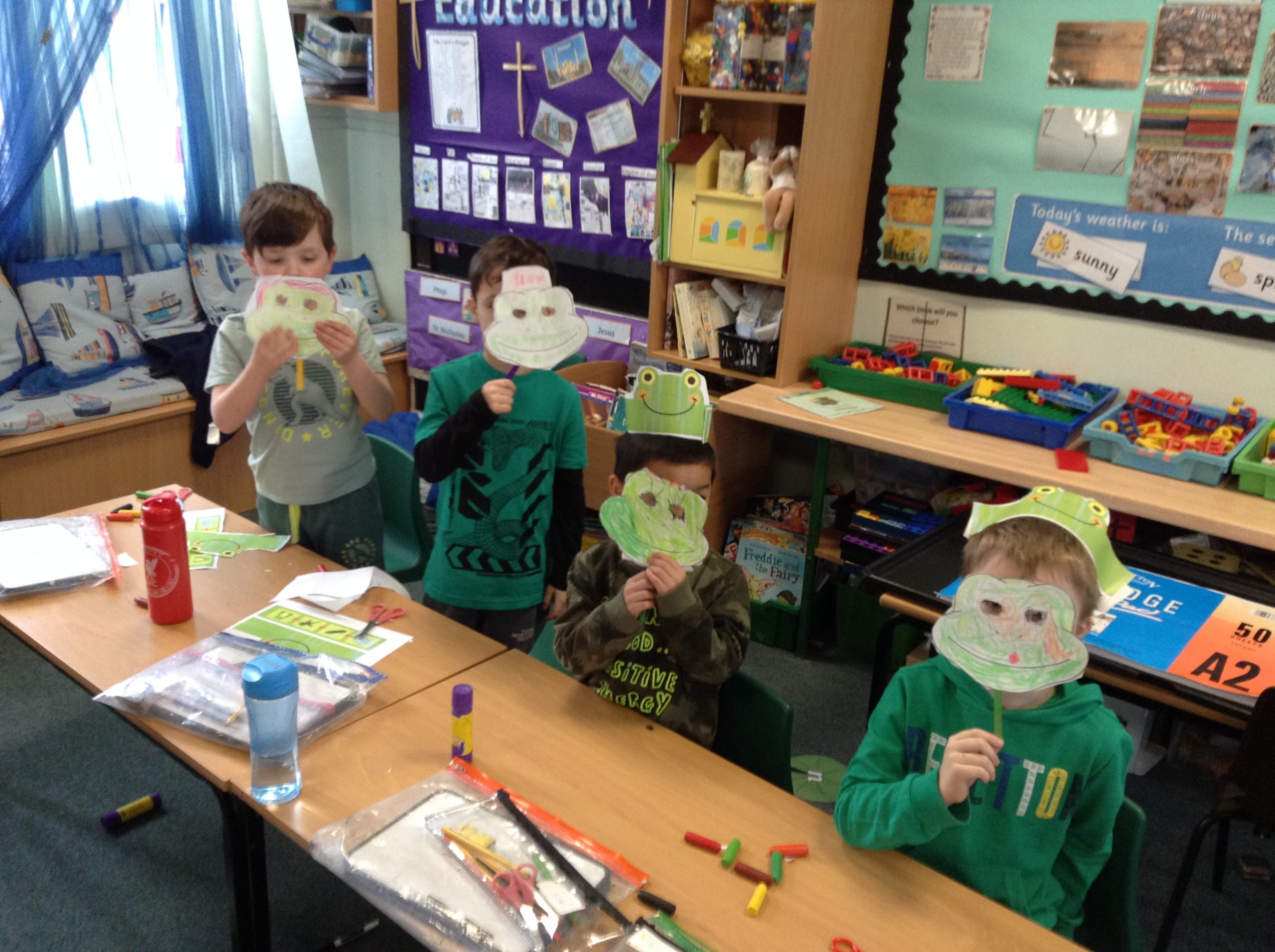 We decided to celebrate our achievements of Phonics that we had been doing at home and in school. We held a Fred Phonics Day and everyone dressed in green to be just like Fred Frog. We played lots of Phonics games, did Phonics activities and Cheryl our cook even made us some green crispy cakes for our snack. We had a great day