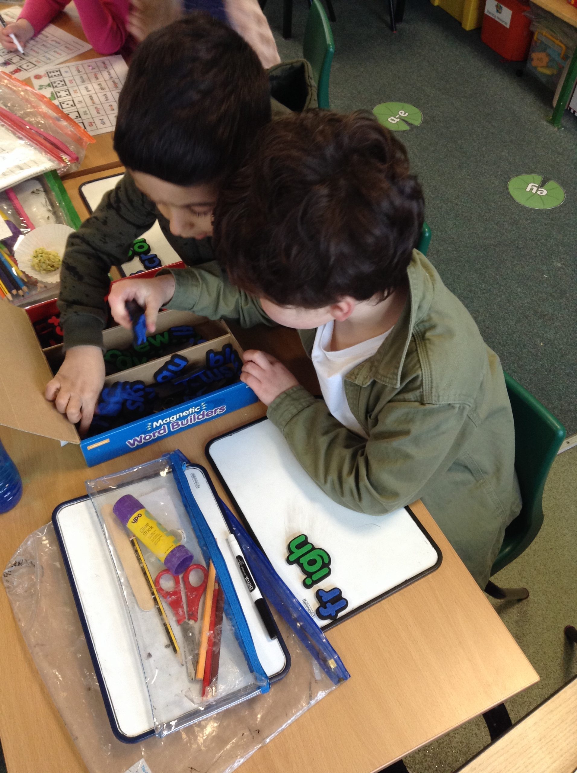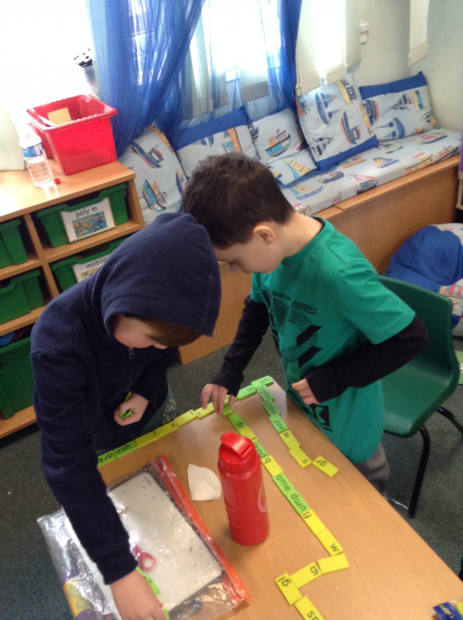 As soon as children have been taught a few initial letter sounds they begin to learn to blend the sounds together to read real words in a Word Time session. Each word time session involves oral blending of known sounds before they are shown the words written down on green cards. Children practice Fred talking the words until they become able to read them on sight. Ditty lessons follow on from this where children who are becoming excellent at reading single words are introduced to reading short sentences. Once children are confident reading the short sentences they are challenged to use their developing phonic knowledge to write a sentence.