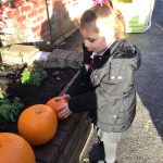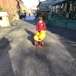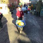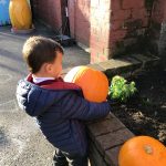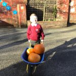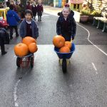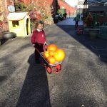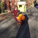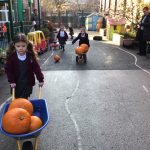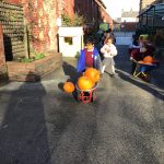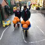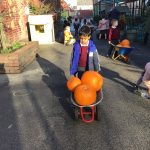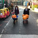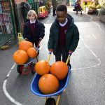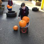 The children further explored pumpkins in a playful investigation, checking how many would fit into a wheelbarrow before it became too full. They then ordered the pumpkins by size, using language such as smallest, bigger, and largest as they compared each one. Finally, they tested whether the pumpkins could be stacked, predicting what might happen and observing how their shapes affected the balance. This hands-on activity encouraged problem-solving, early measurement skills, and lots of rich mathematical talk.