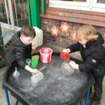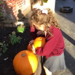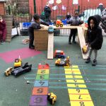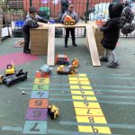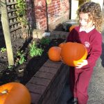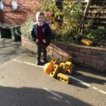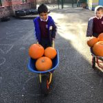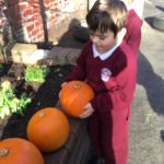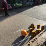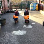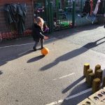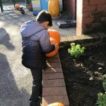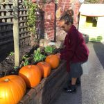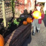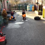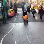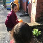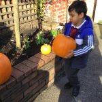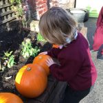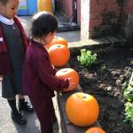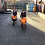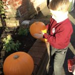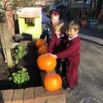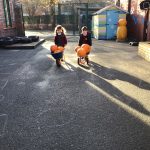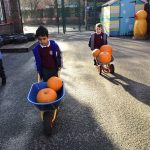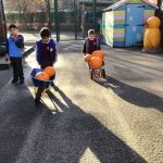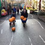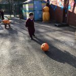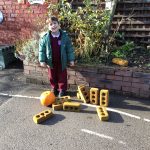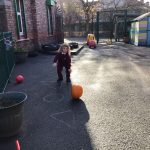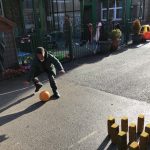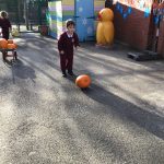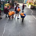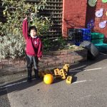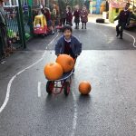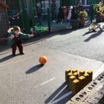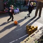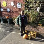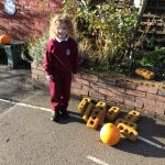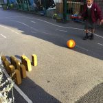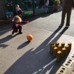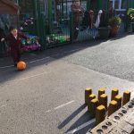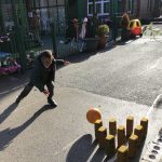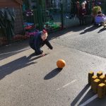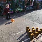 Reception apply their developing mathematical skills through applying their subitising and counting skills in outdoor games. How many blocks will the pumpkin knock down when it’s rolled like a bowling ball? The children were invited to estimate first—they guessed how many blocks standing upright will fall when the pumpkin hits them. After rolling the pumpkin into the blocks, they counted how many blocks had been knocked down (taken away) and how many are still remaining, giving them natural opportunities to practise subtraction and compare quantities. The children had lots of fun rolling the pumpkins again and again, adding more blocks, or taking some away, creating lots of rich “maths talk” as they predicted outcomes and tested their ideas together.