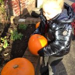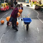 How many pumpkins will fit into the wheelbarrow before they topple out? Estimate! Does it matter how big or how heavy each pumpkin is? Have a go! Add one more. Take one out. Lots of opportunities for “maths talk” during this activity.