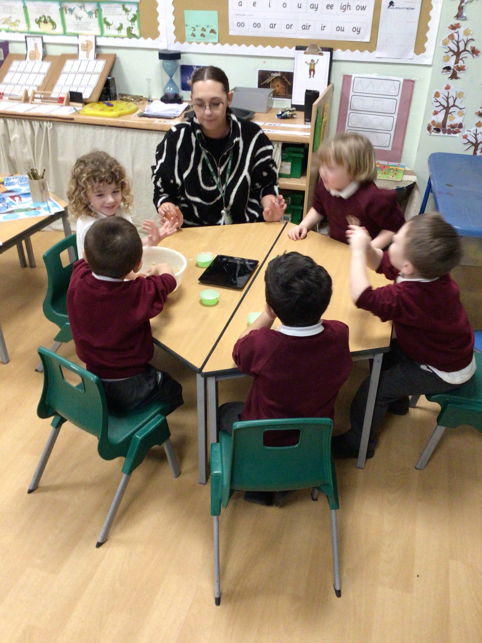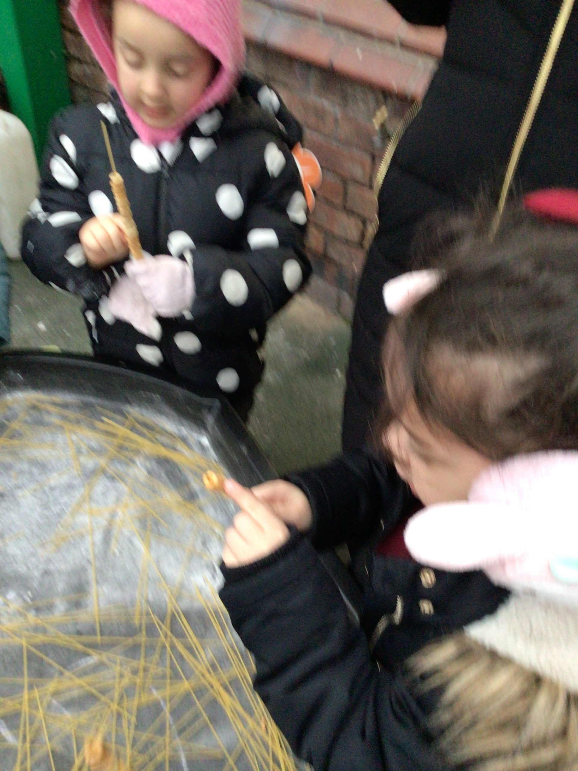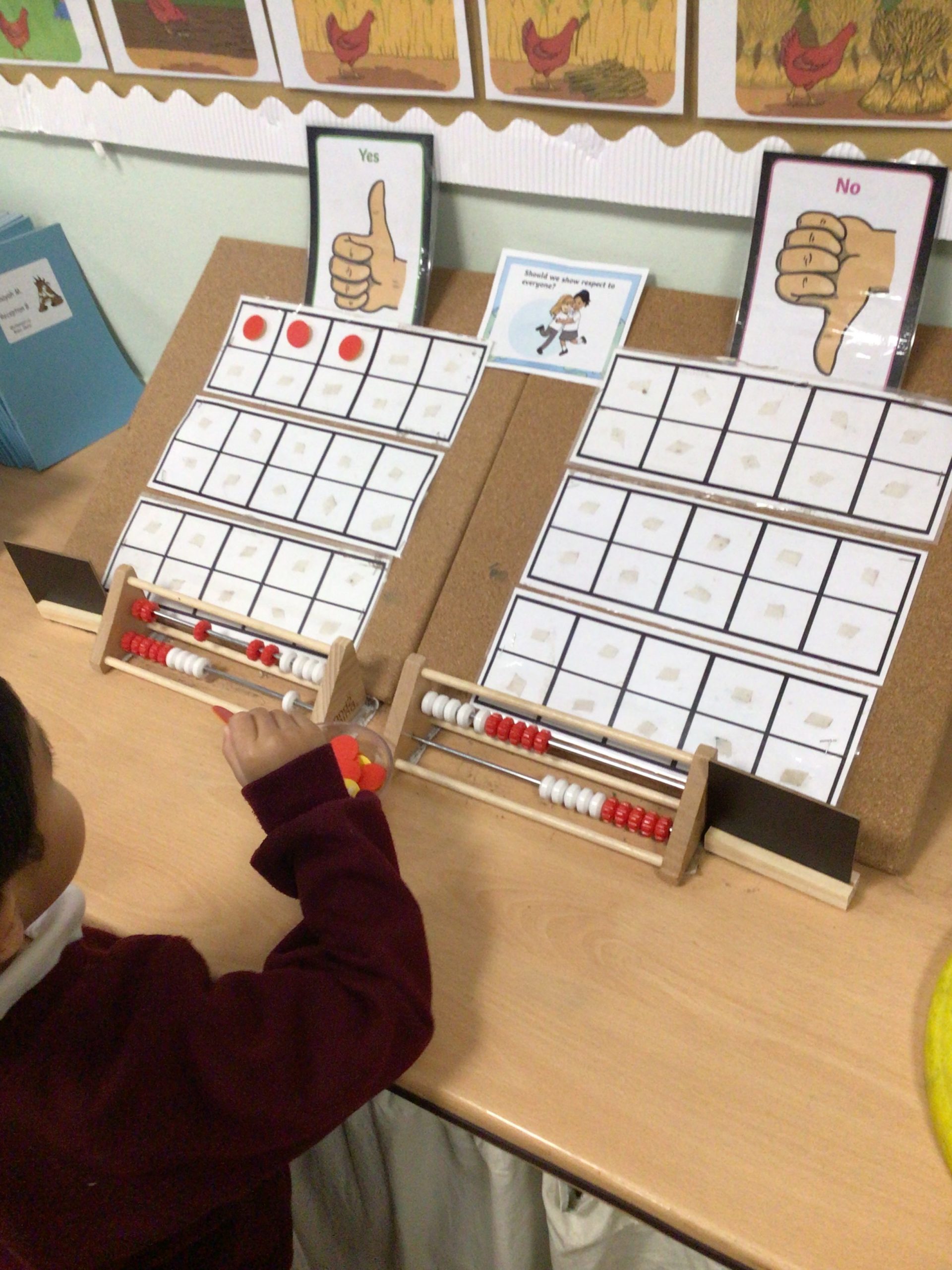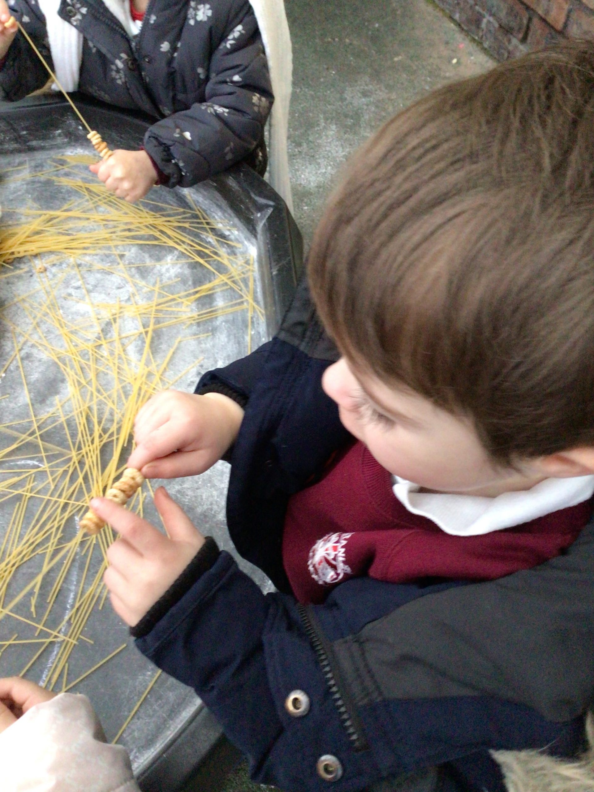 Reception are comparing number through play. Who has threaded the most? “I have the most because mine is the longest”. Let’s count and check.”