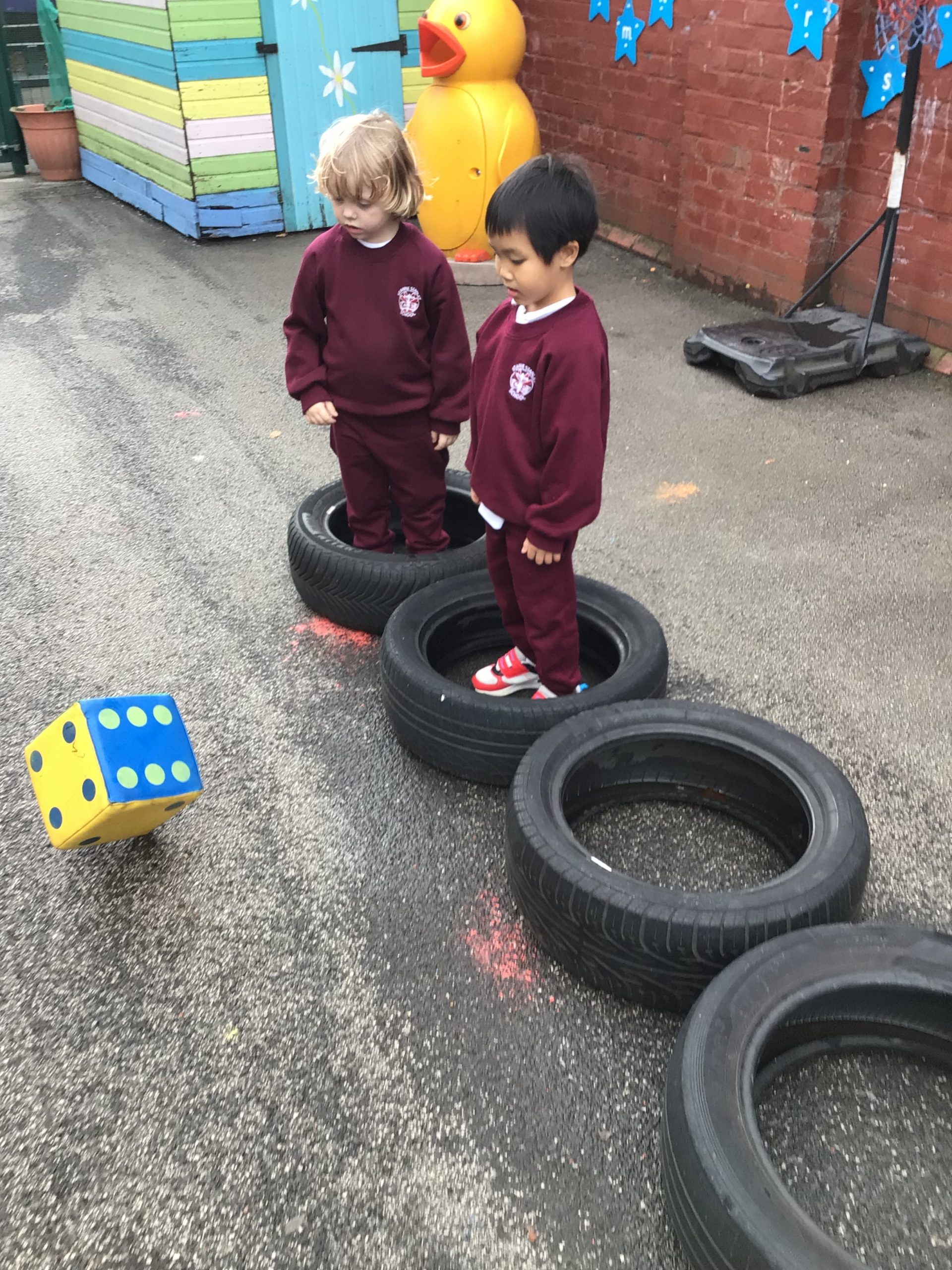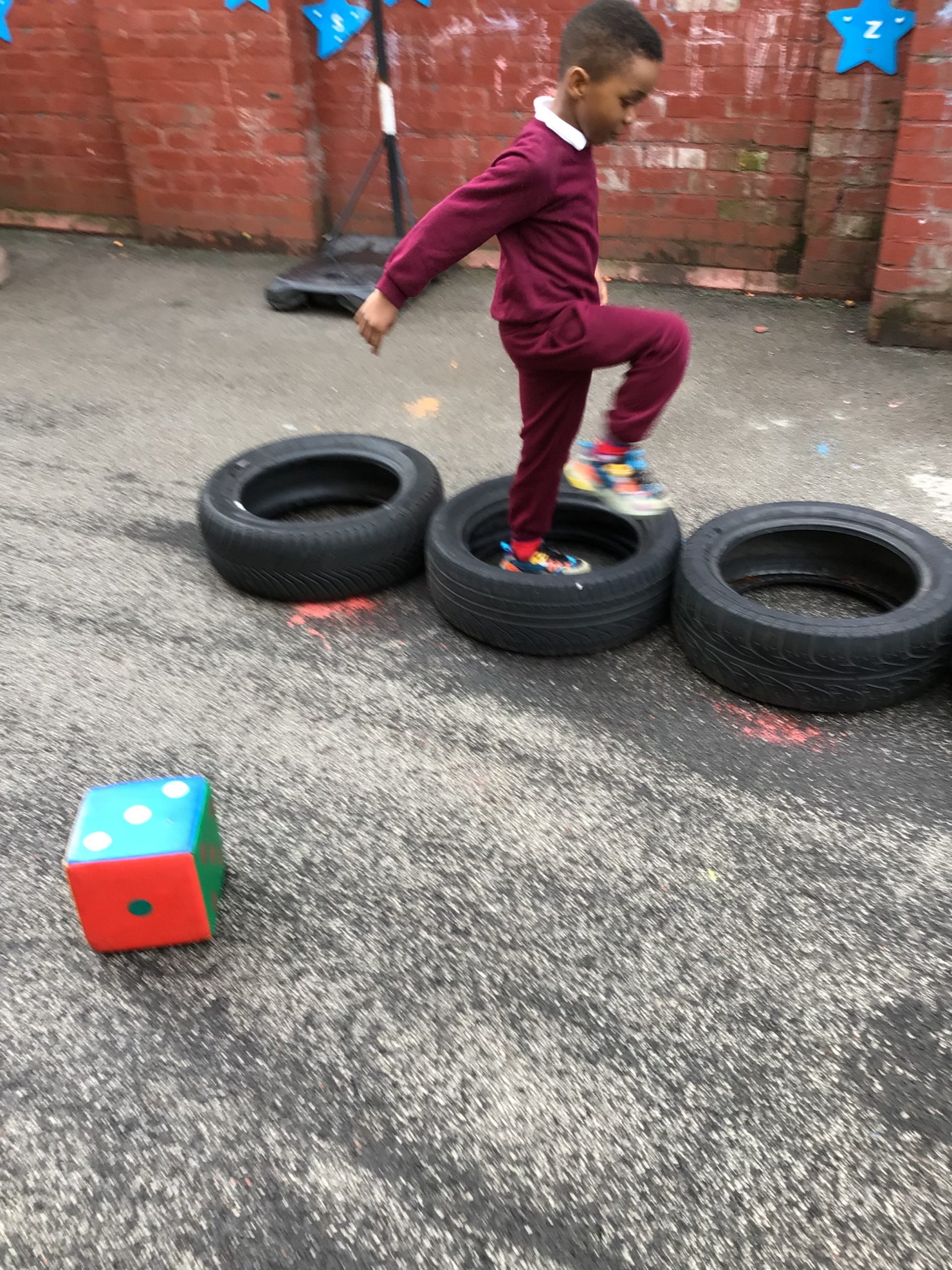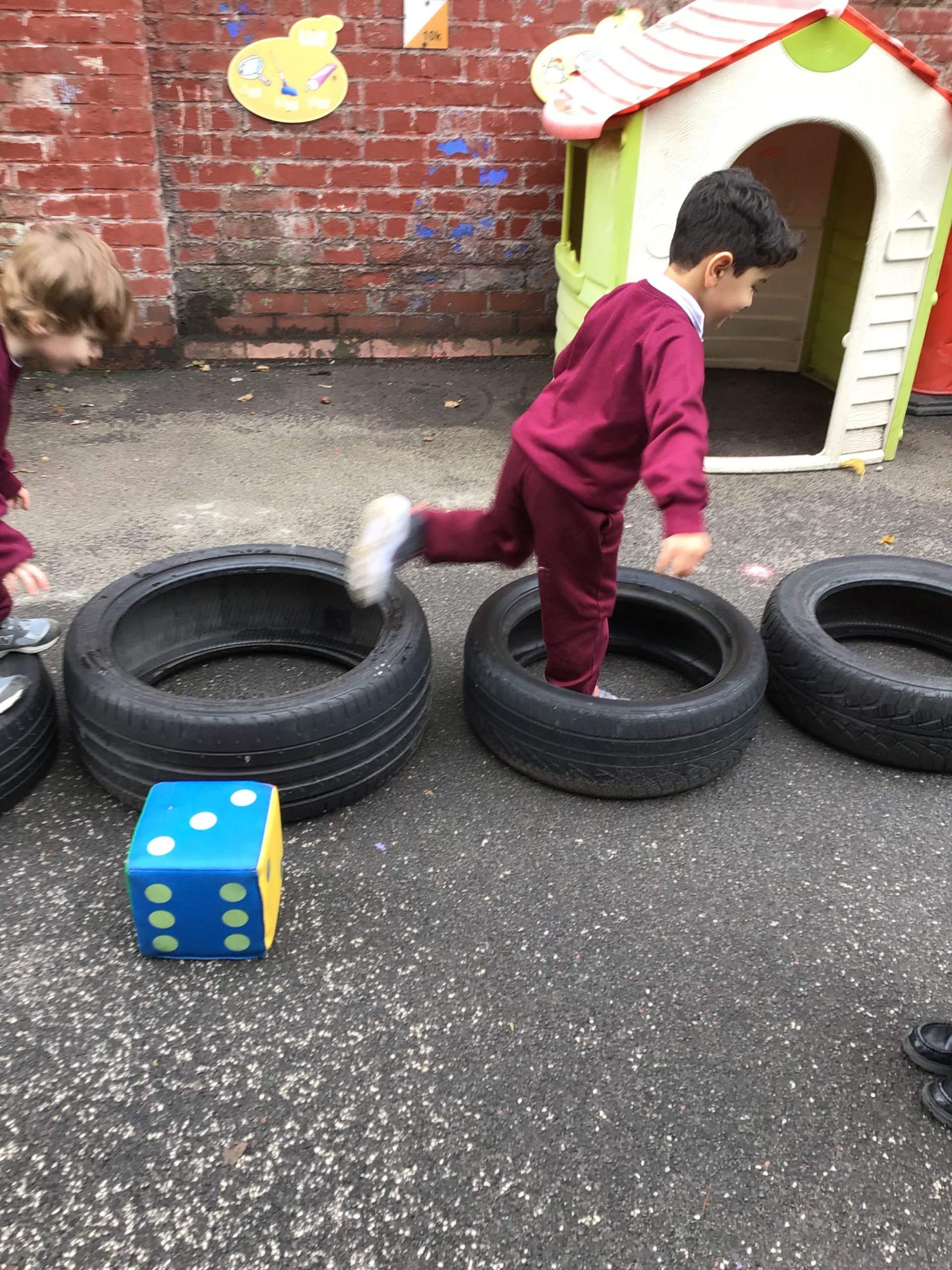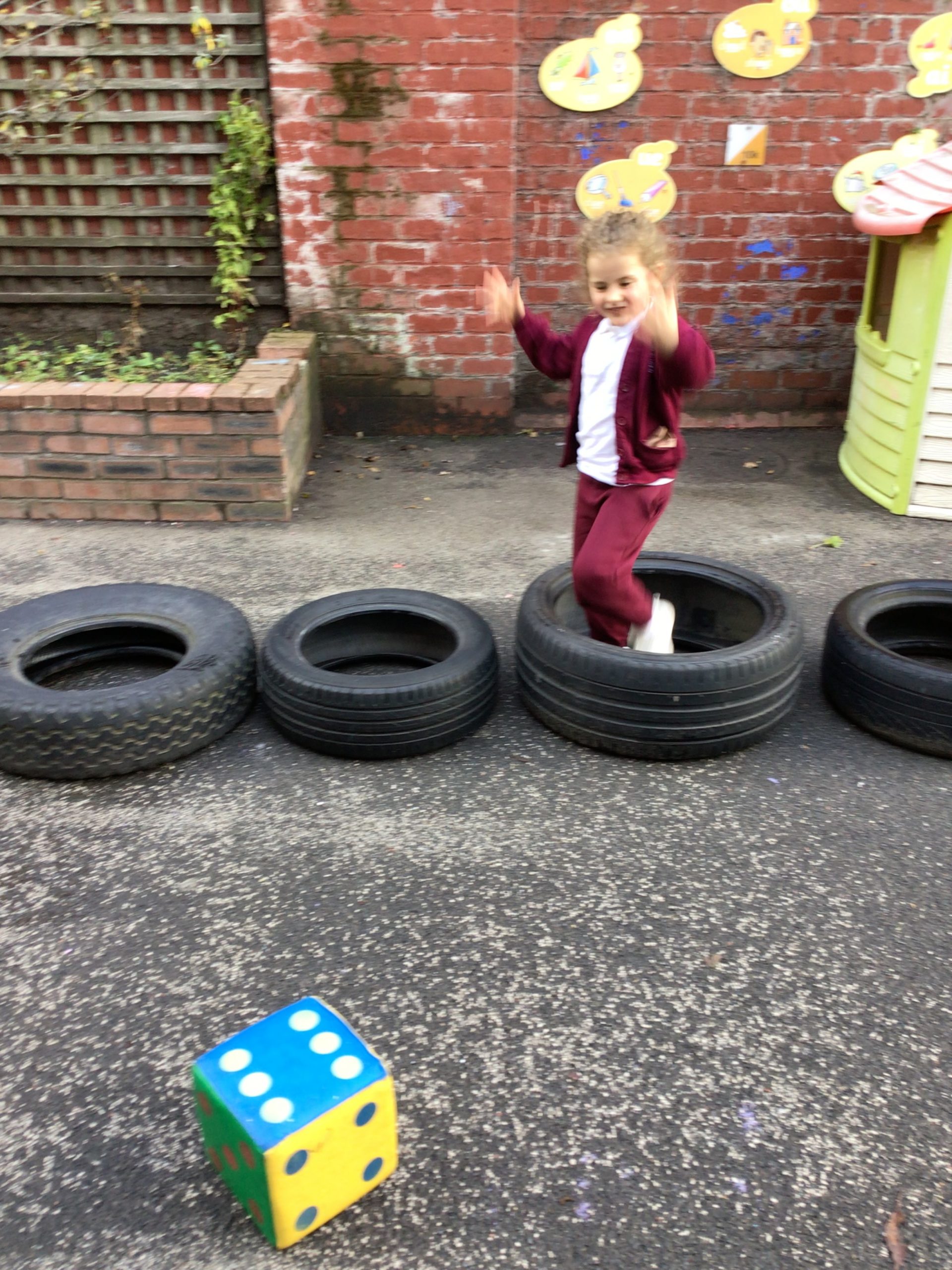 Reception are developing their mathematical skills through applying their subitising and counting skills in an outdoor numbers game. The children rolled a dice, subitised the dot pattern on display, before jumping across that number of tyres.