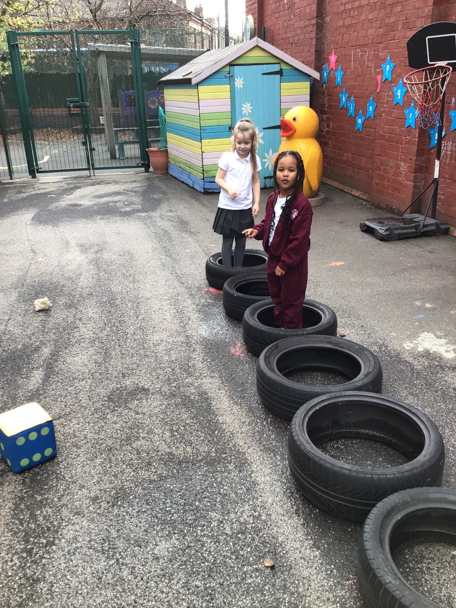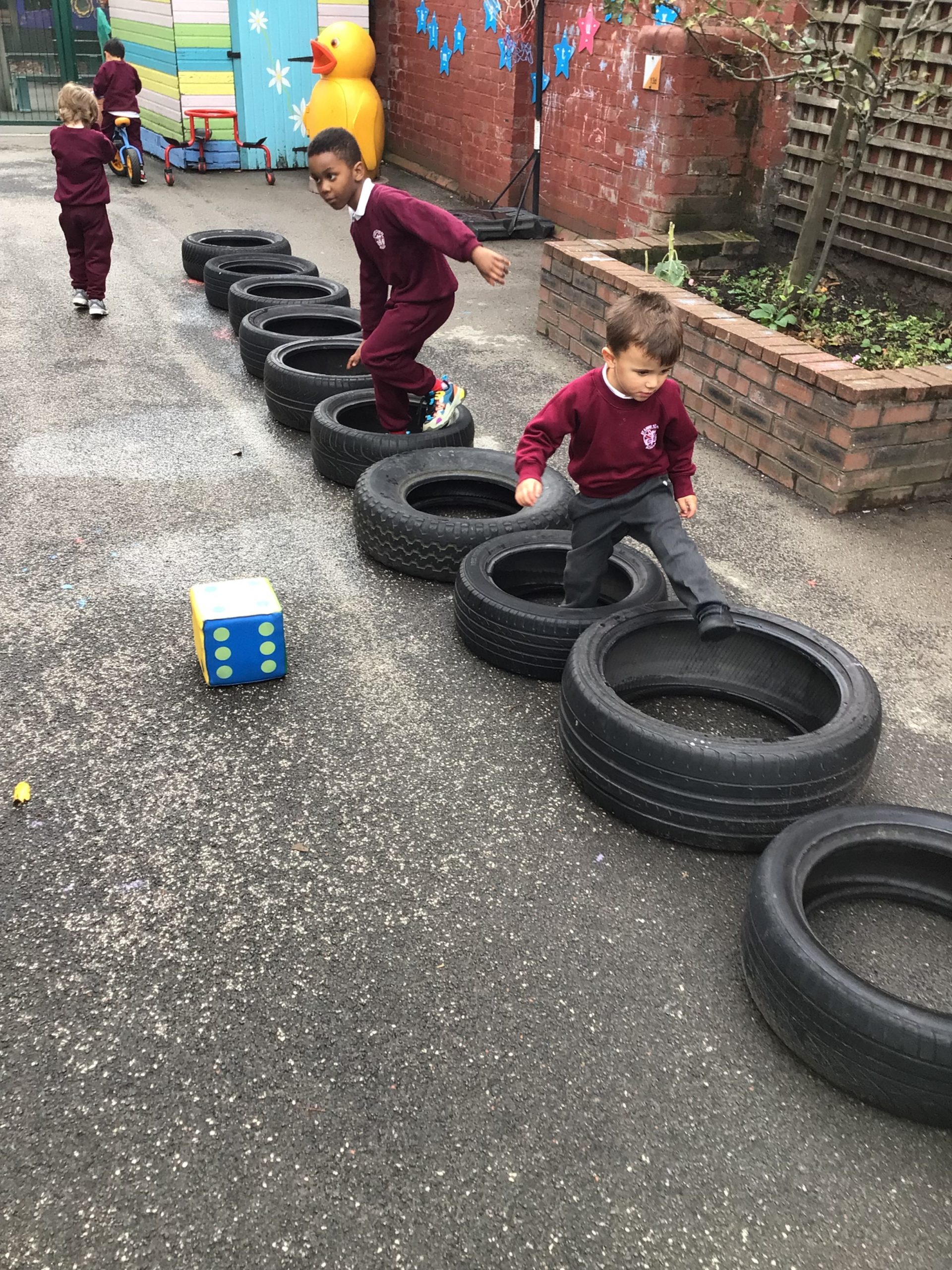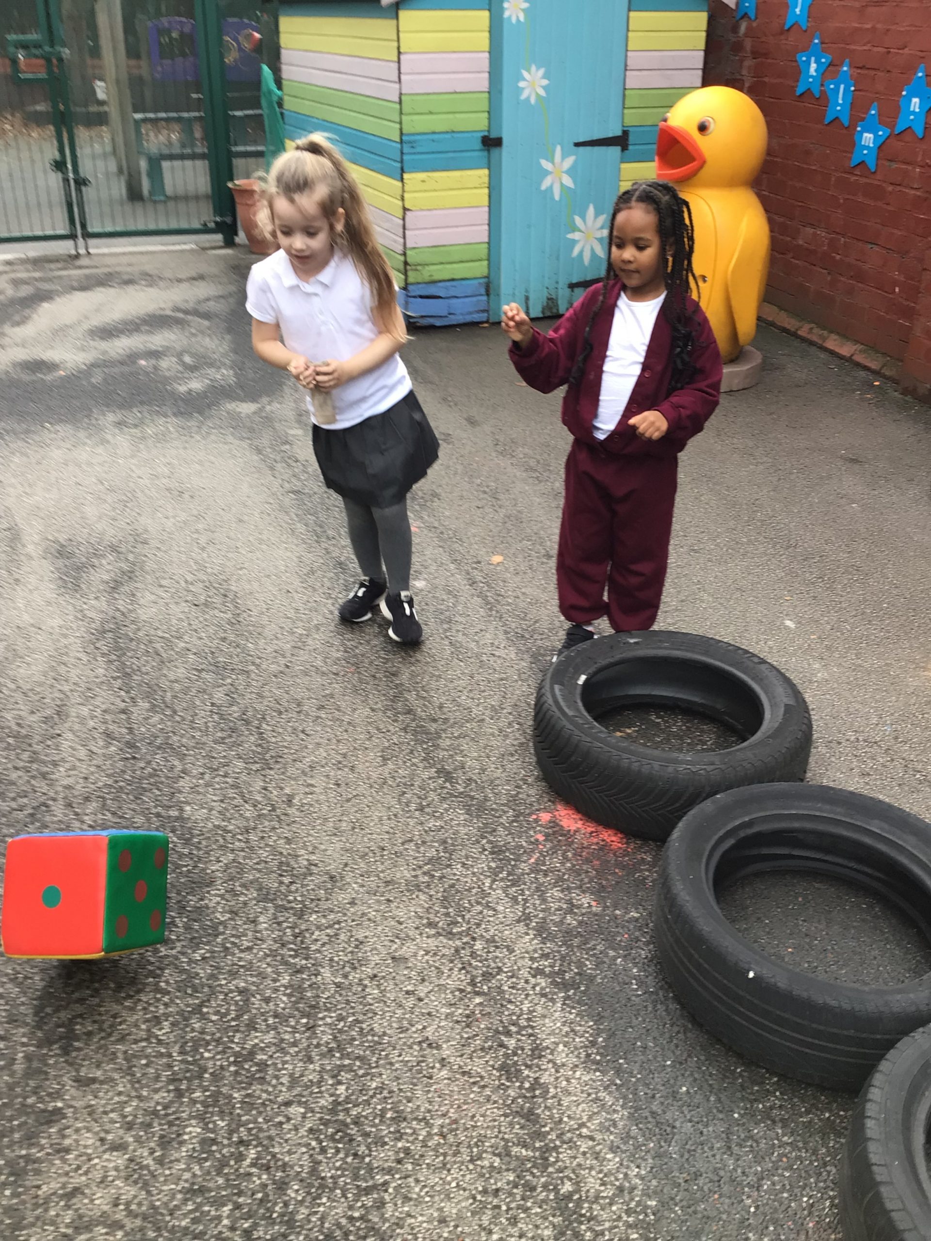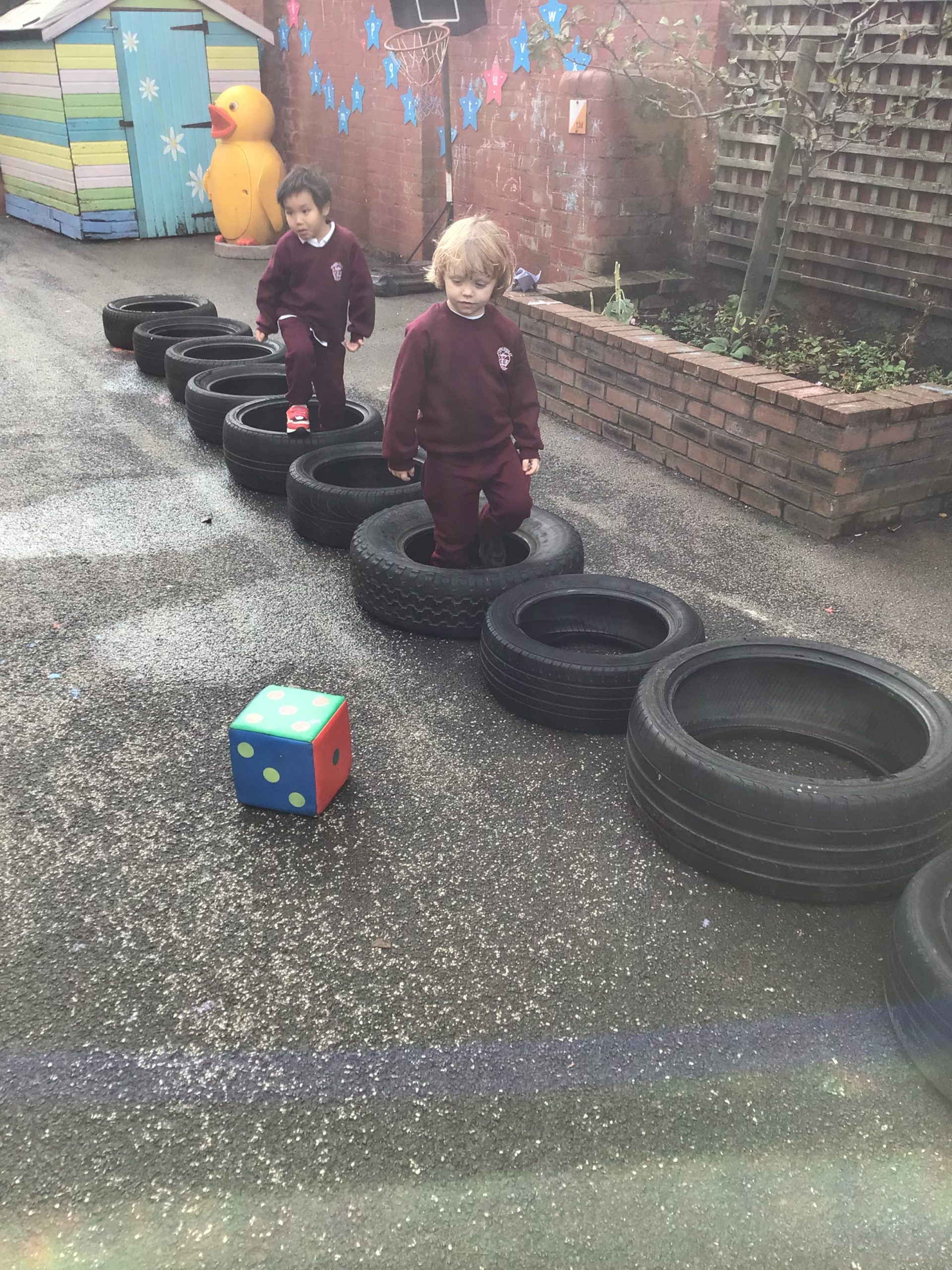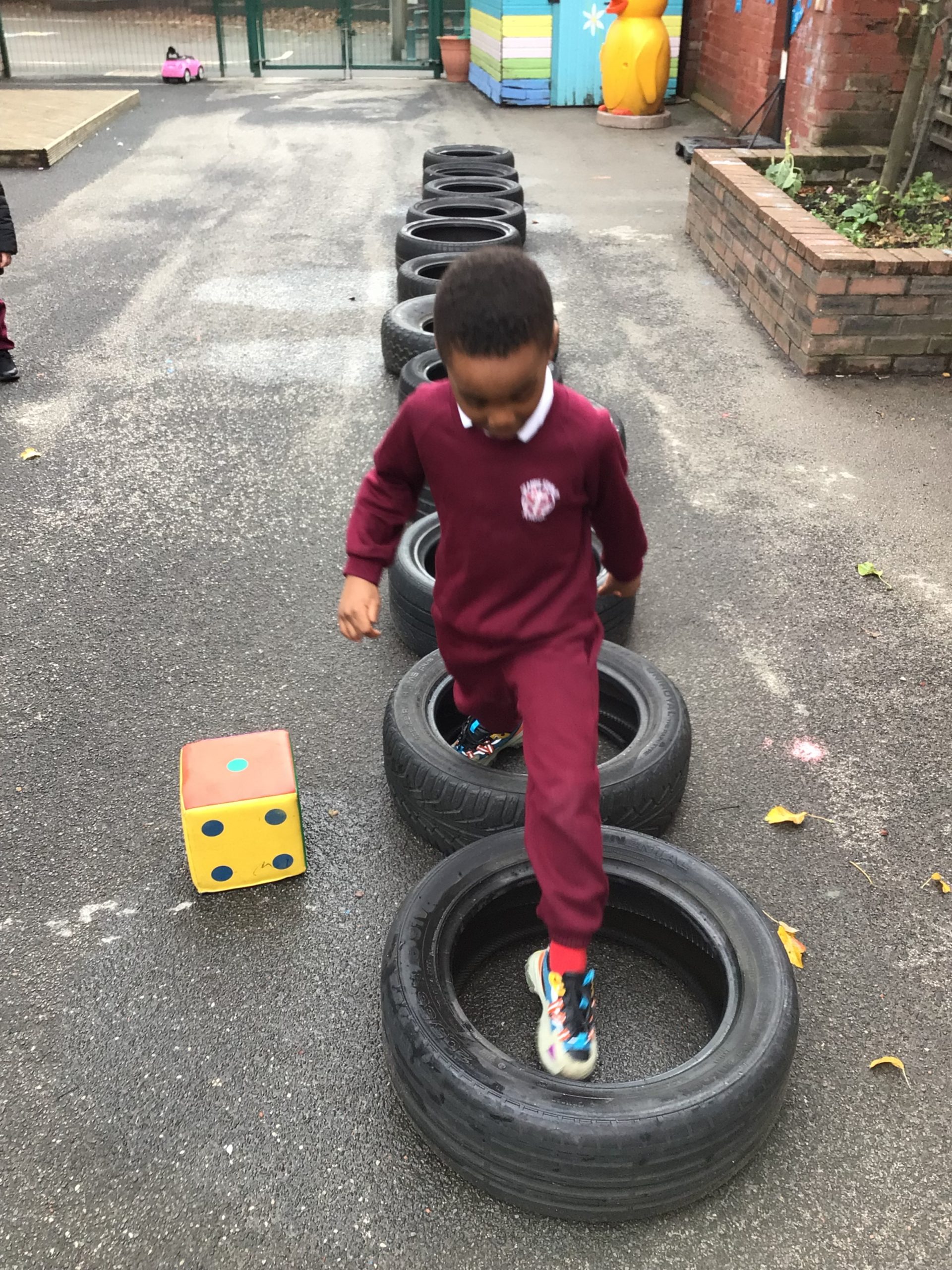 Reception are developing their mathematical skills through applying their subitising and counting skills in an outdoor numbers game. The children rolled a dice, subitised the dot pattern on display, before jumping across that number of tyres.