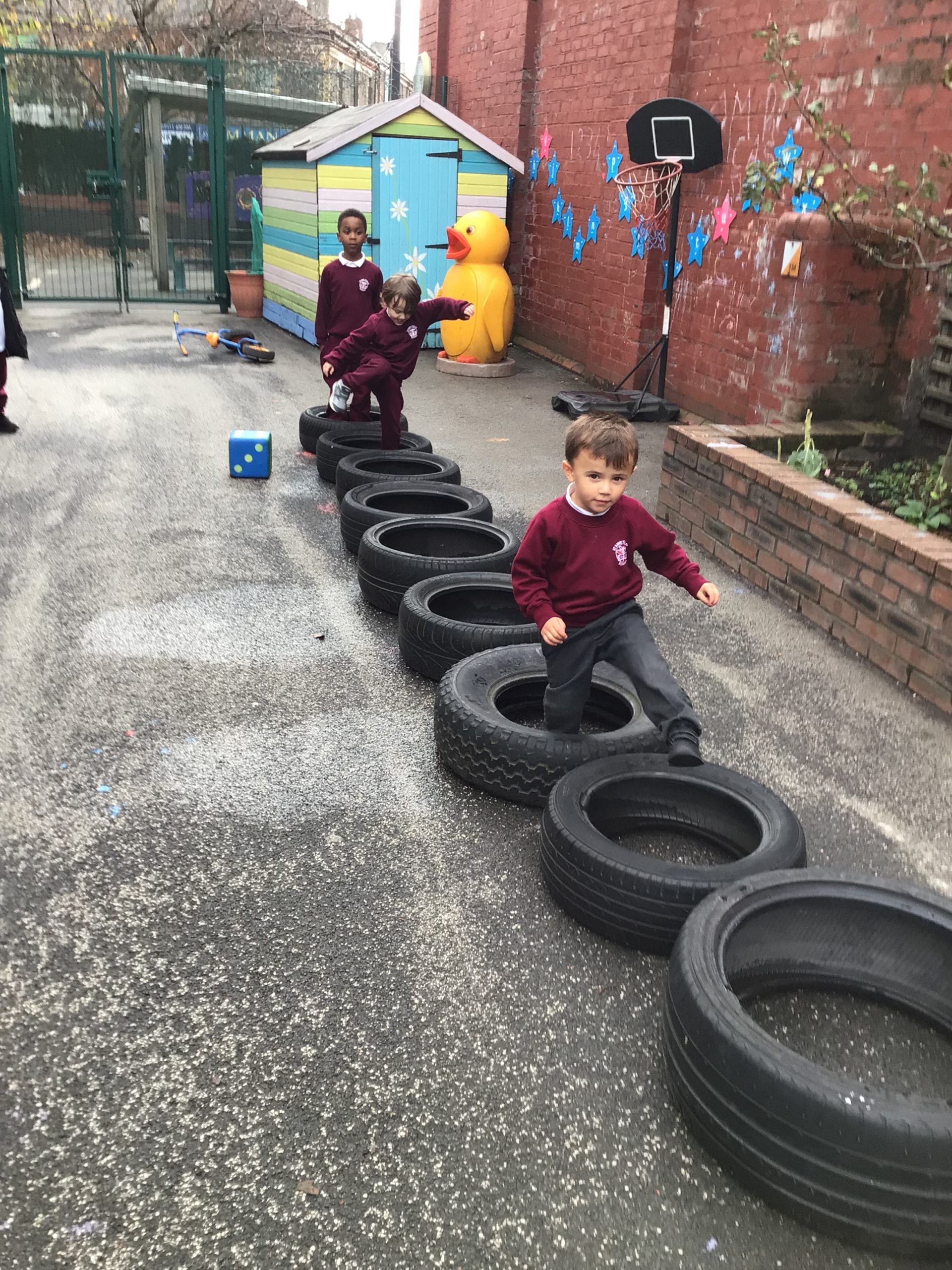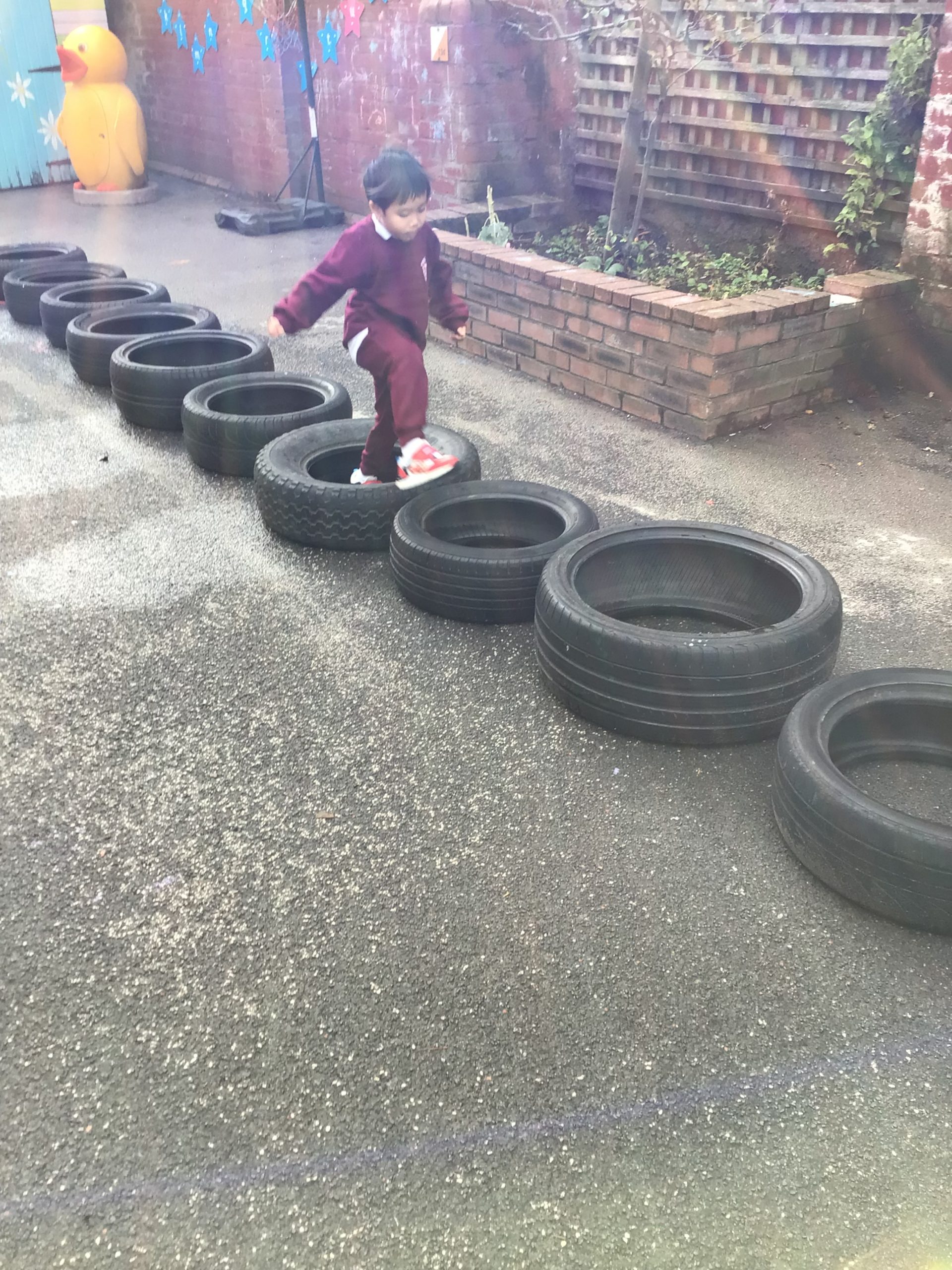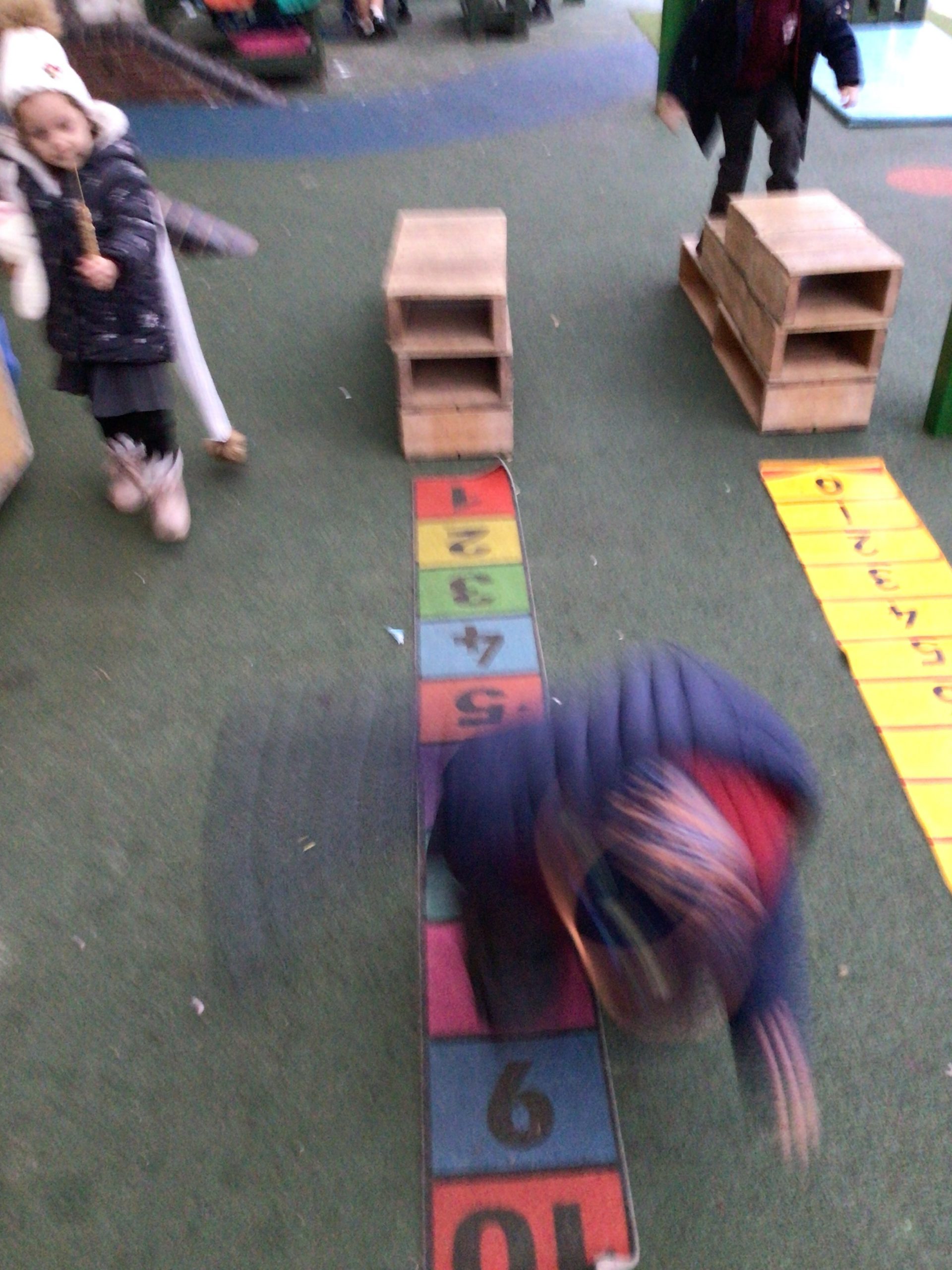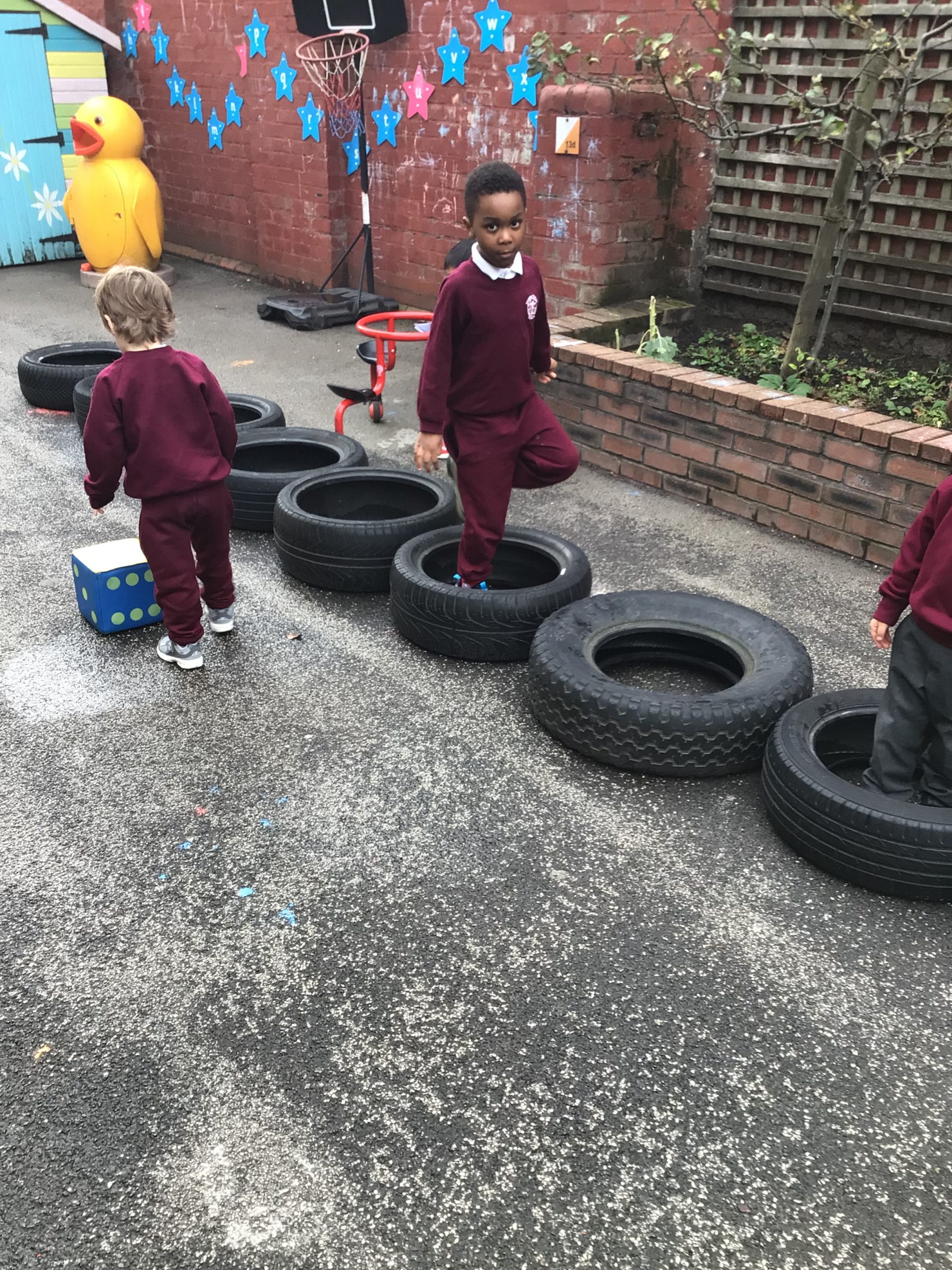 Reception are developing their mathematical skills through applying their subitising and counting skills in an outdoor numbers game. The children rolled a dice, subitised the dot pattern on display, before jumping across that number of tyres.