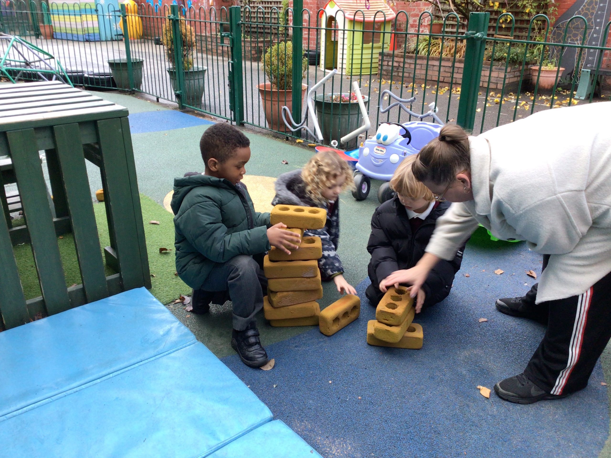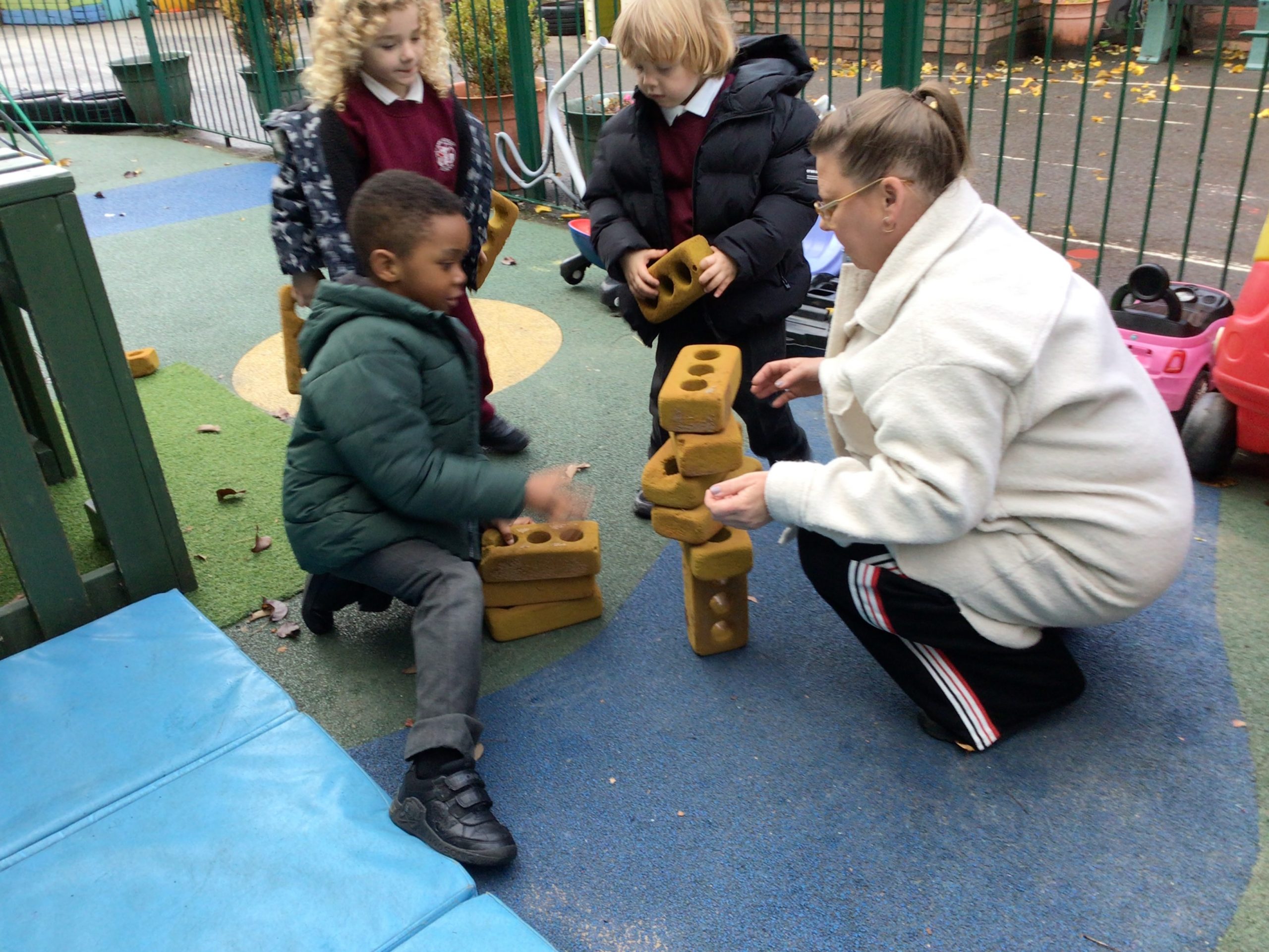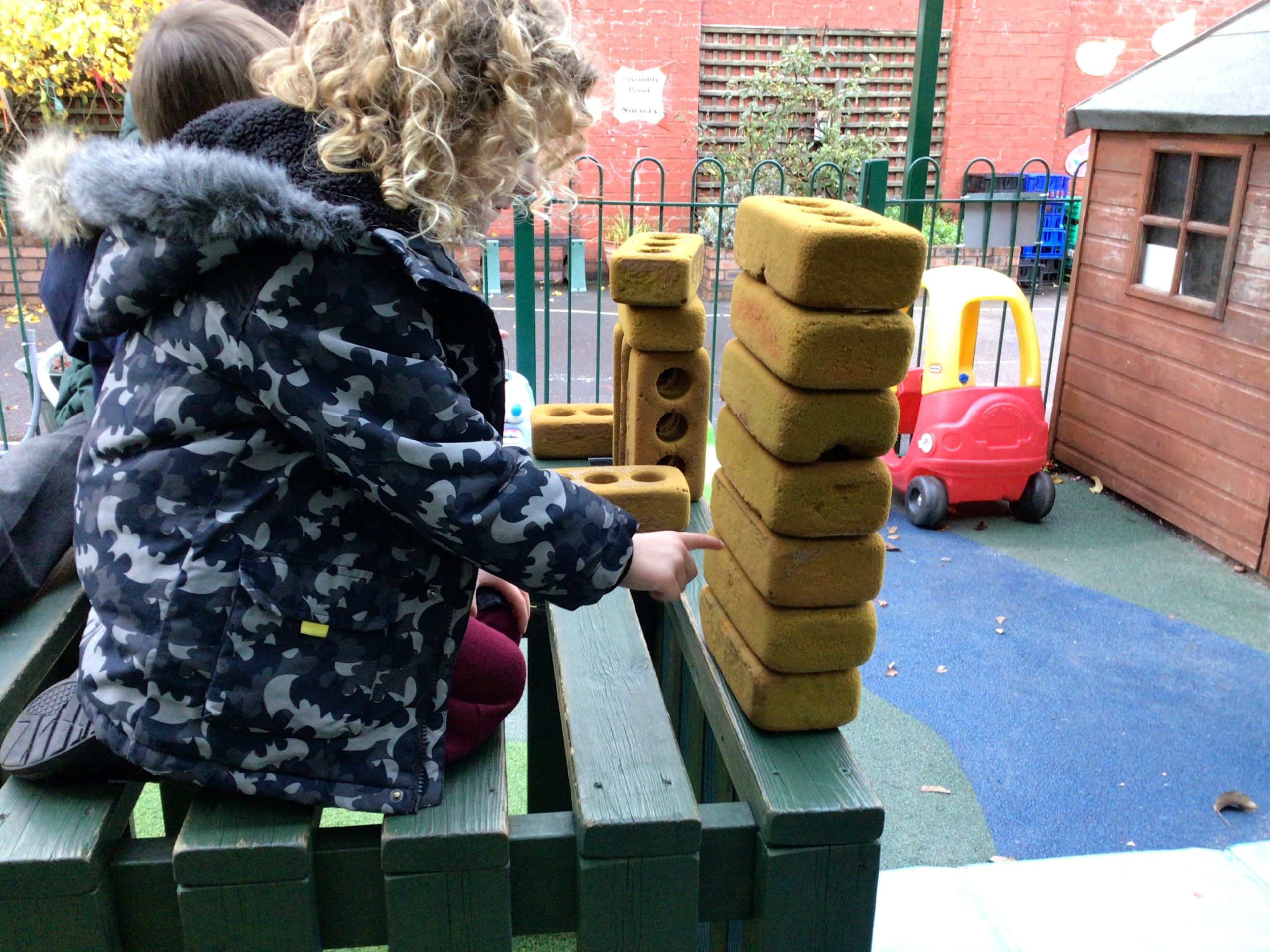 Reception are counting objects in our outdoor provision, counting on as we add blocks to build towers of different heights.