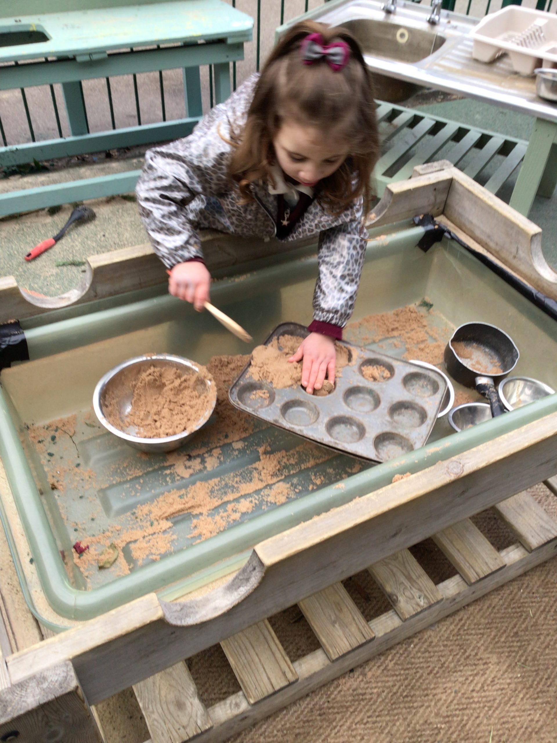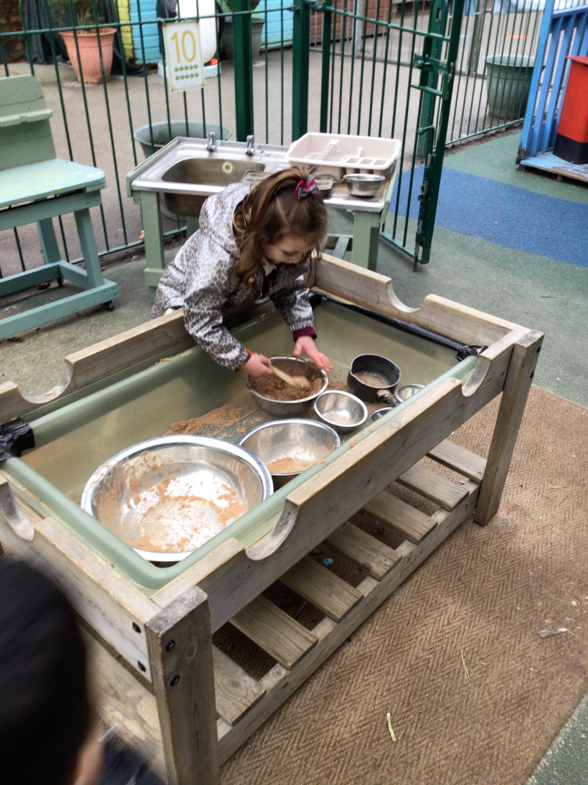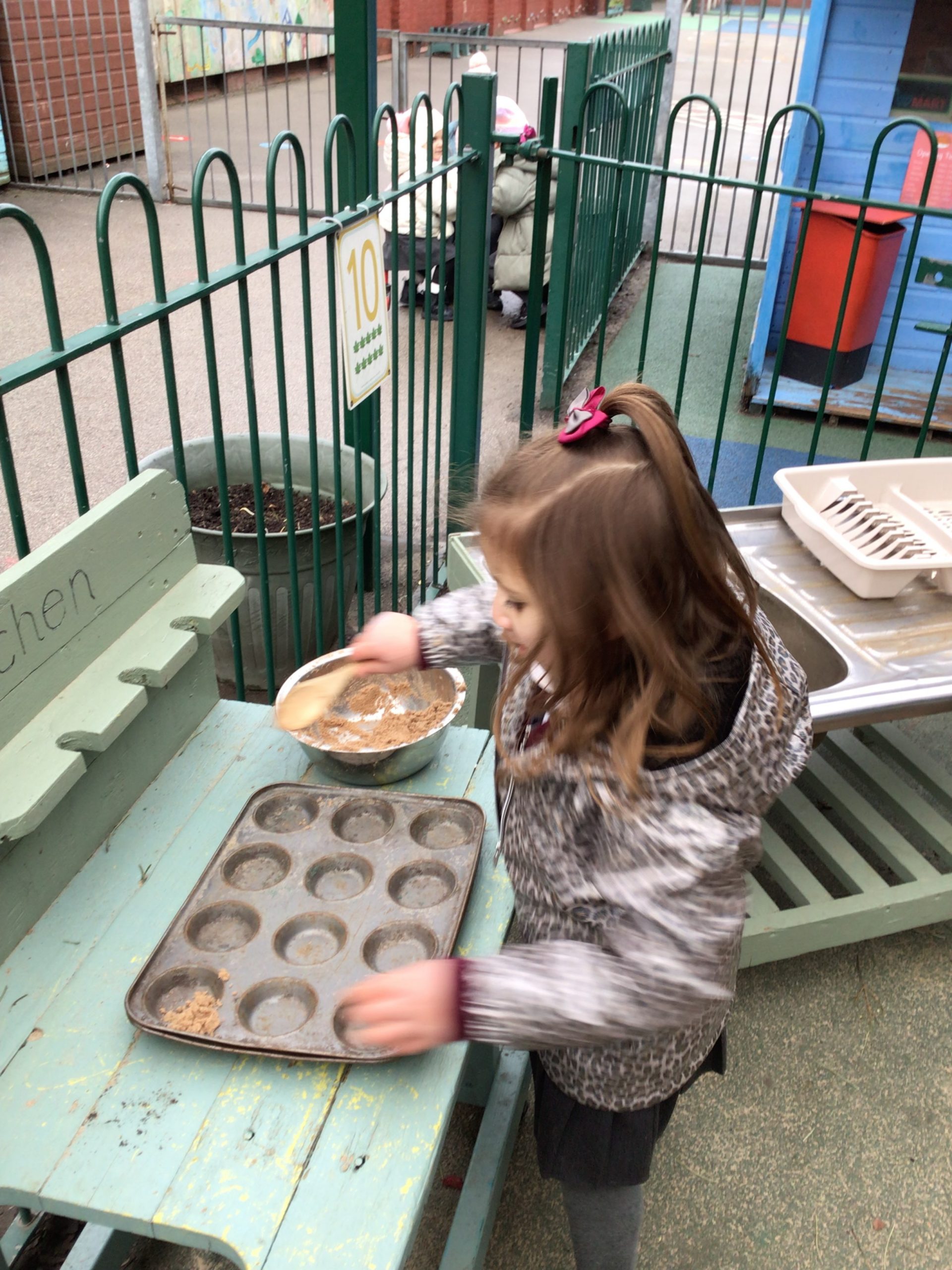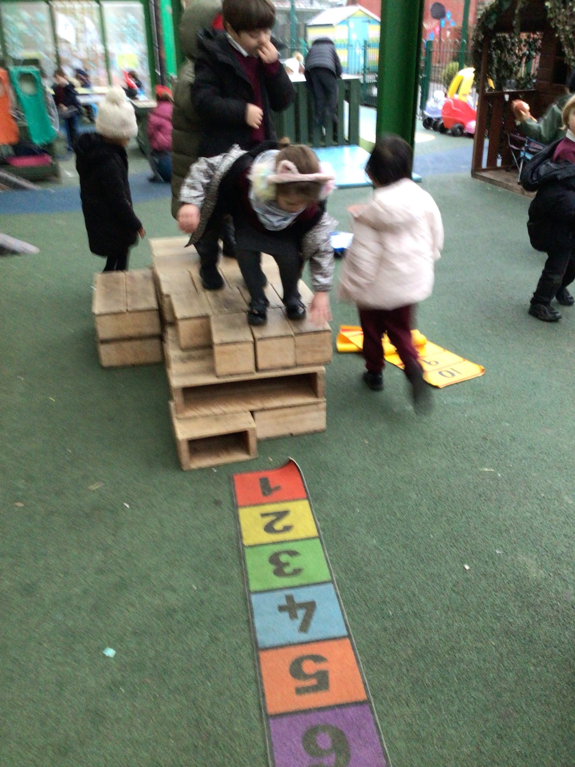 Reception are counting objects in our outdoor provision, counting on as we add blocks to build towers of different heights.