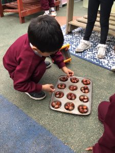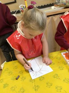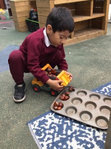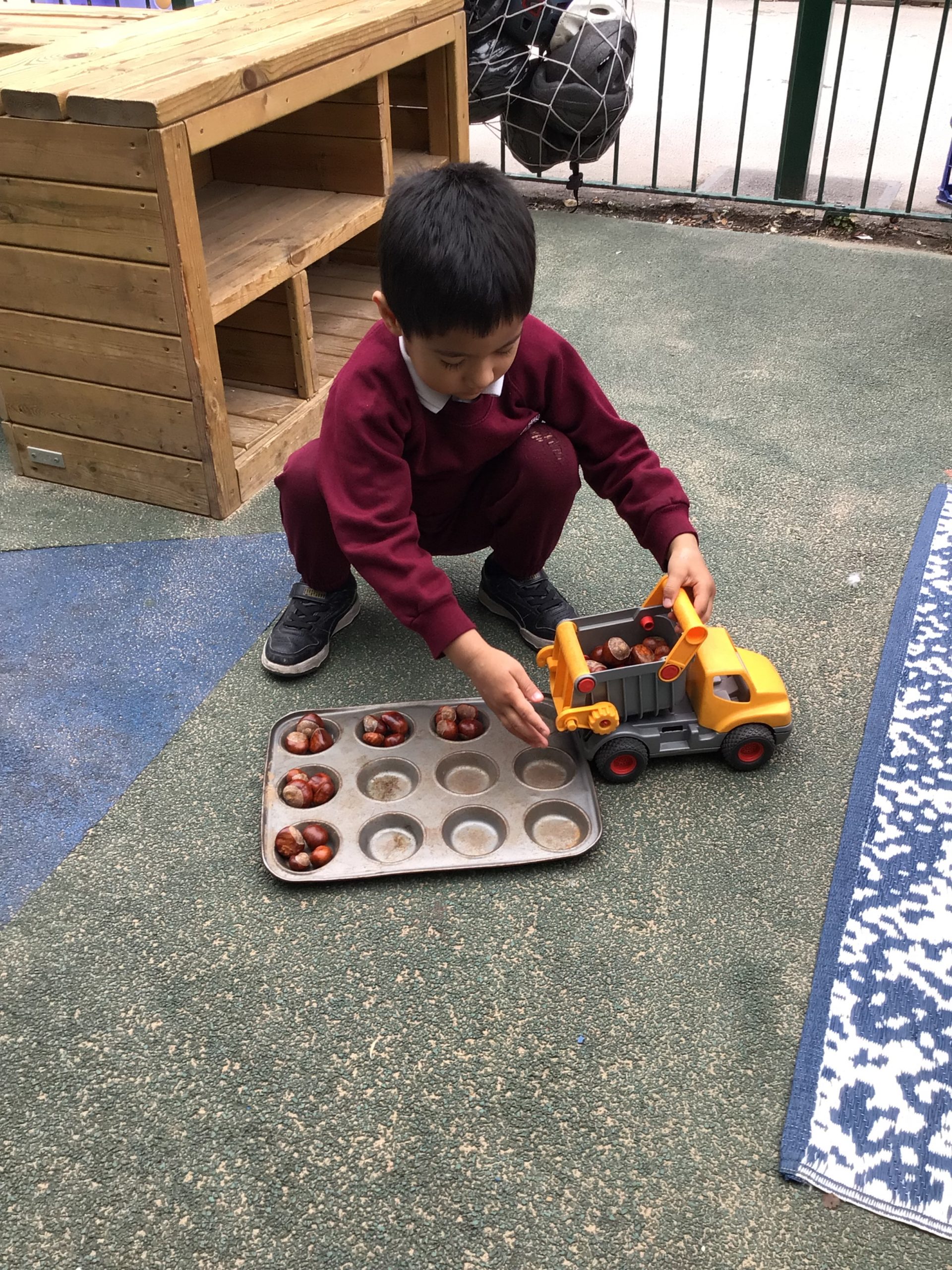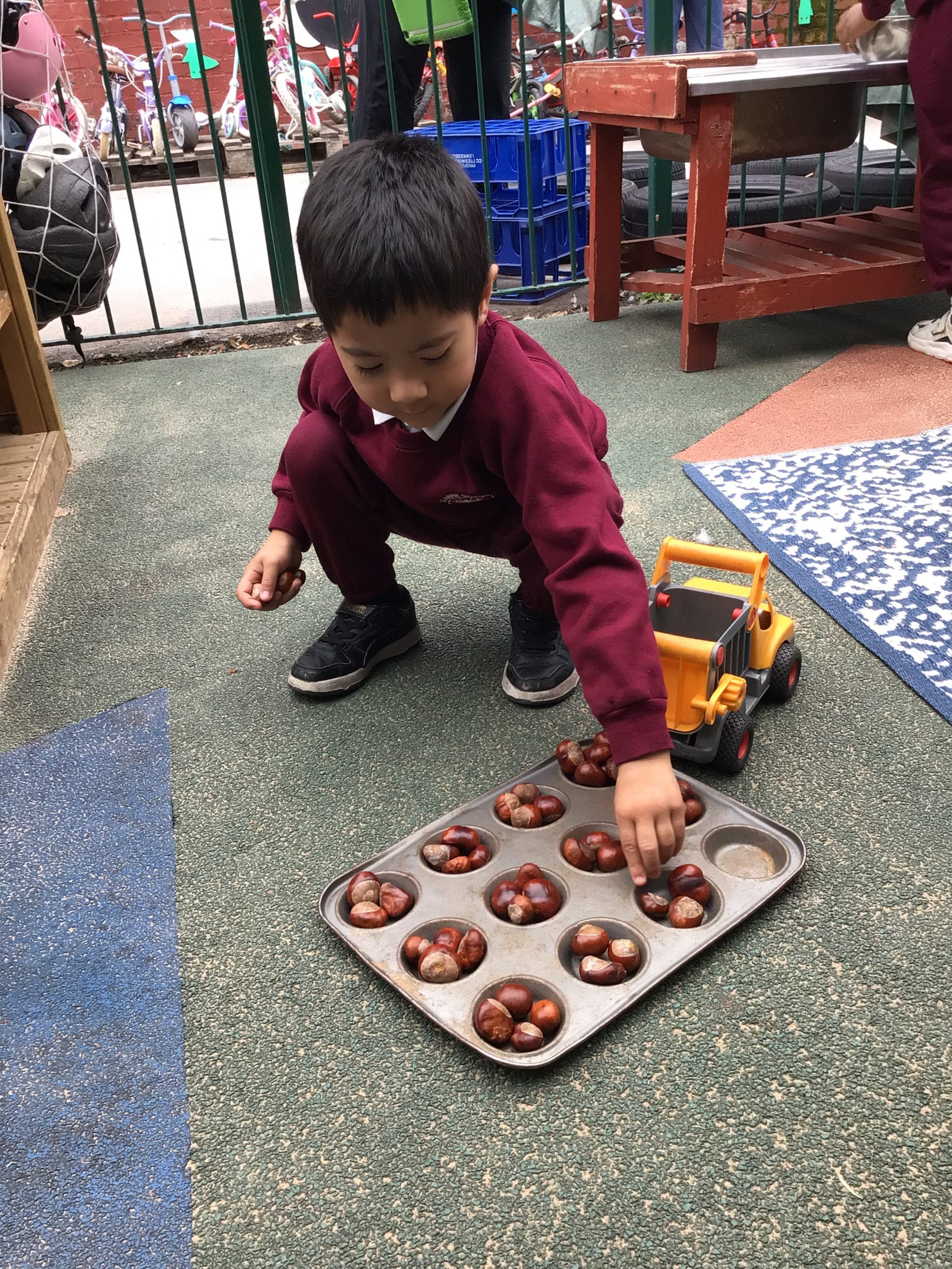Counting within the provision whilst adding branches to the tree, leaves to the branches and exploring conkers in the outdoor provision. |