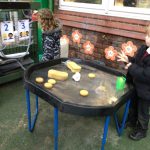 Reception are thinking about the perspectives of others as work as a team to funnel water through a pipe into a container before emptying the container into a tray to be absorbed by sponges and before wringing the sponges out to refill the jugs!