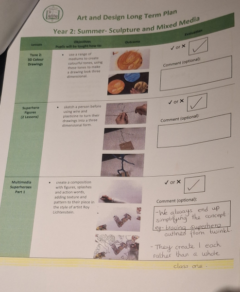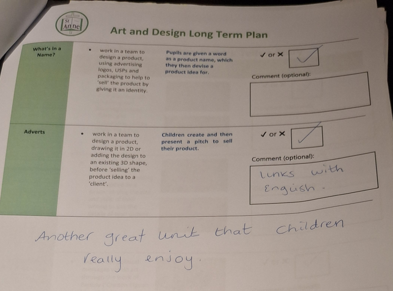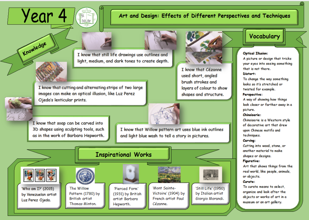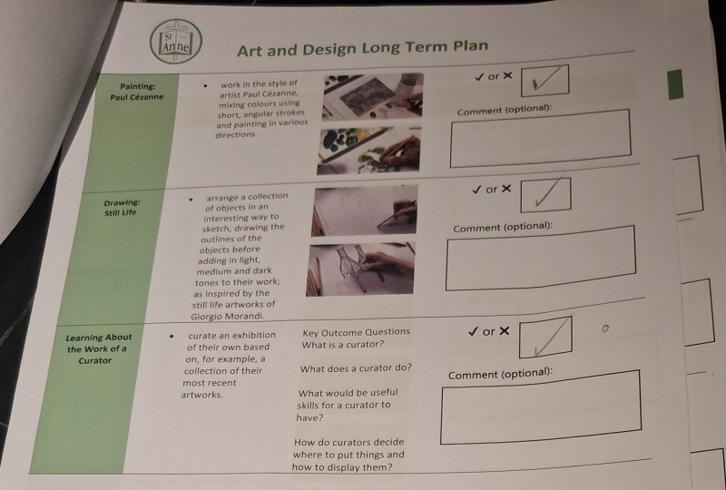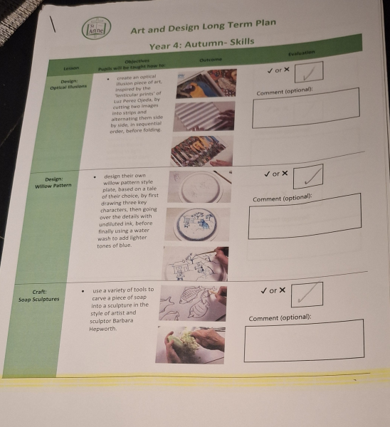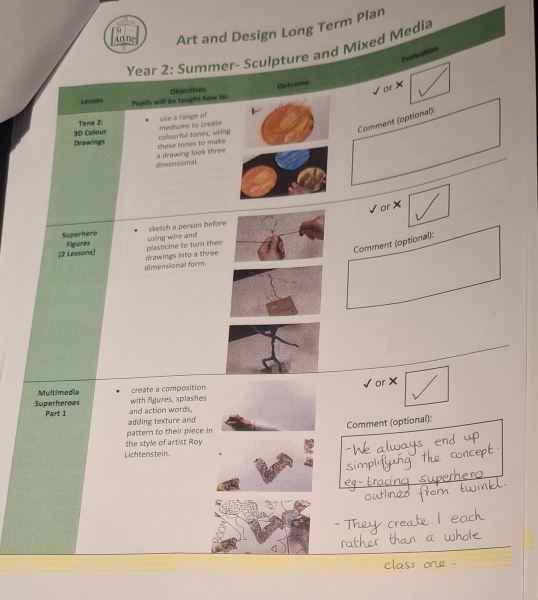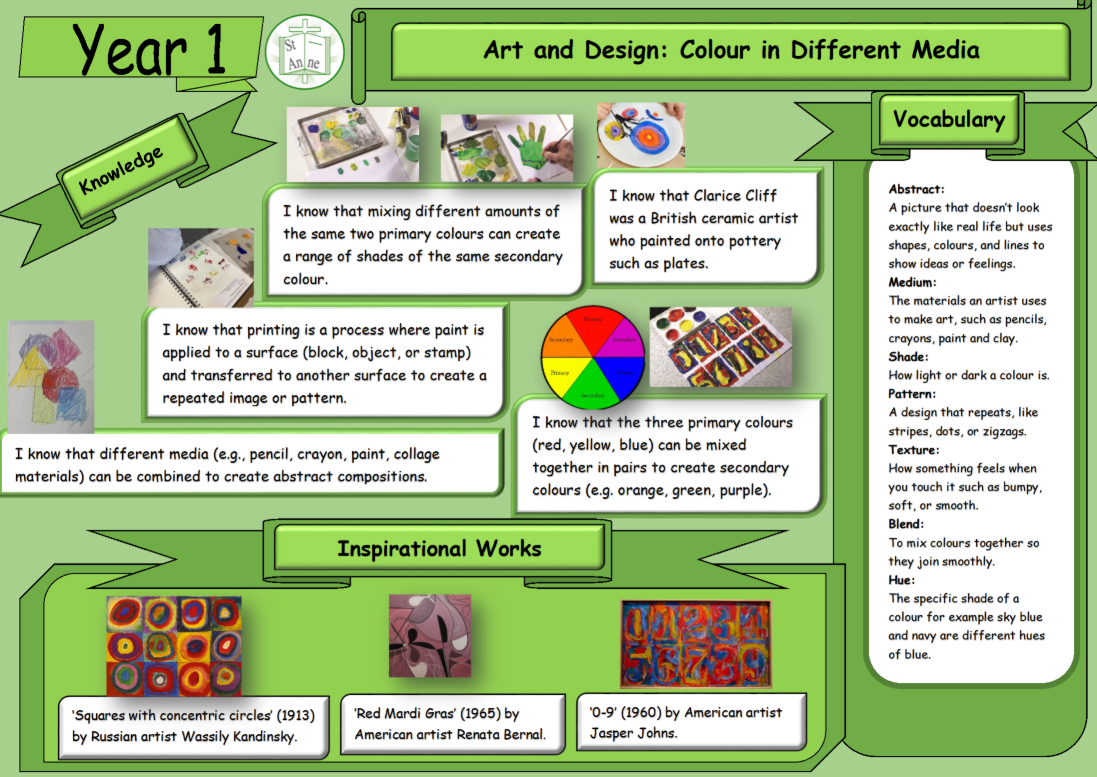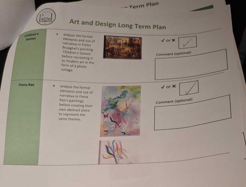 Art and Design at St Anne Stanley is built on the strong foundations of the Kapow Primary framework, drawing on its high‑quality lessons while shaping them into a bespoke sequence that meets the needs of our pupils and our school context. During the initial implementation of Kapow, lessons were diligently selected from across the framework and brought together in a carefully curated way, ensuring progression, coherence and breadth. When Kapow later released a new series of updated, high‑quality lessons, I carried out a full curriculum audit to evaluate the effectiveness of our existing units. Staff completed a simple but highly informative audit: they ticked the lessons that were working well in practice and crossed those they felt should be replaced. This feedback directly informed the refinement of our curriculum, allowing us to remove lessons that were not fully meeting our aims and replace them with alternatives from the new Kapow series. The result is a bespoke, responsive curriculum that blends the best of the original and updated Kapow lessons, ensuring high‑quality learning experiences across all year groups.